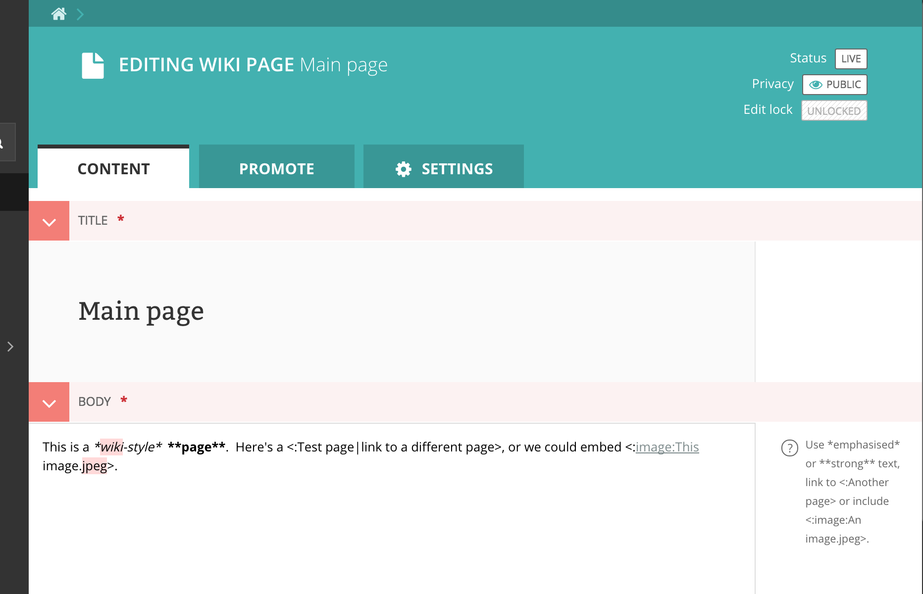 <:My page name|link title>or<:page:My page title><:doc:My fancy document.pdf><:image:My pretty image.jpeg>,<:image:My pretty image.jpeg|left>(leftclassname),<:image:My pretty image.jpeg|right>(rightclassname),<:image:My pretty image.jpeg|full>(full-nameclassname),<:image:My pretty image.jpeg|width=123>(outputs a rendition withwidth-123, and classleft)