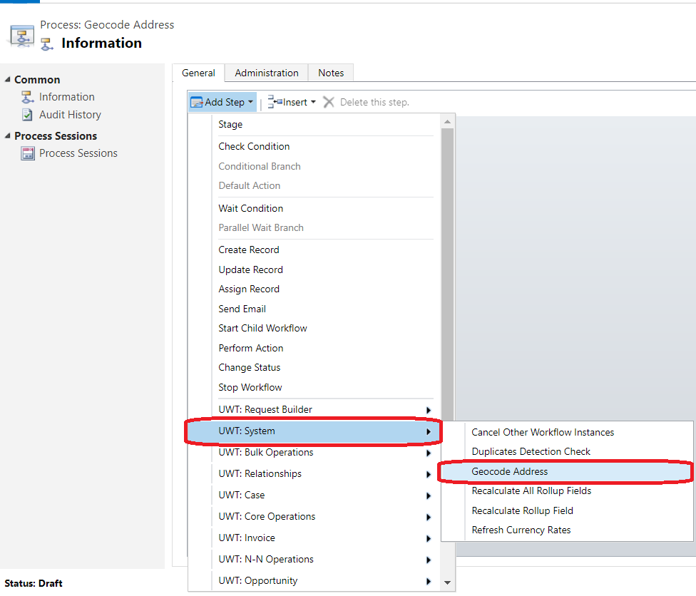 Once this is done you can use "UWT: System: Geocode Address" in your workflow: