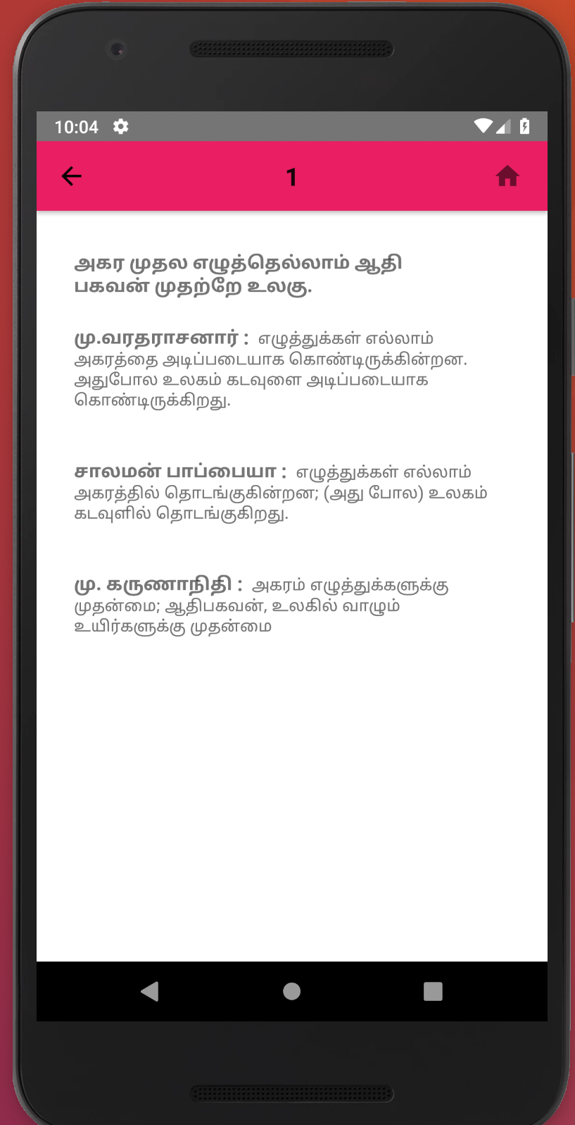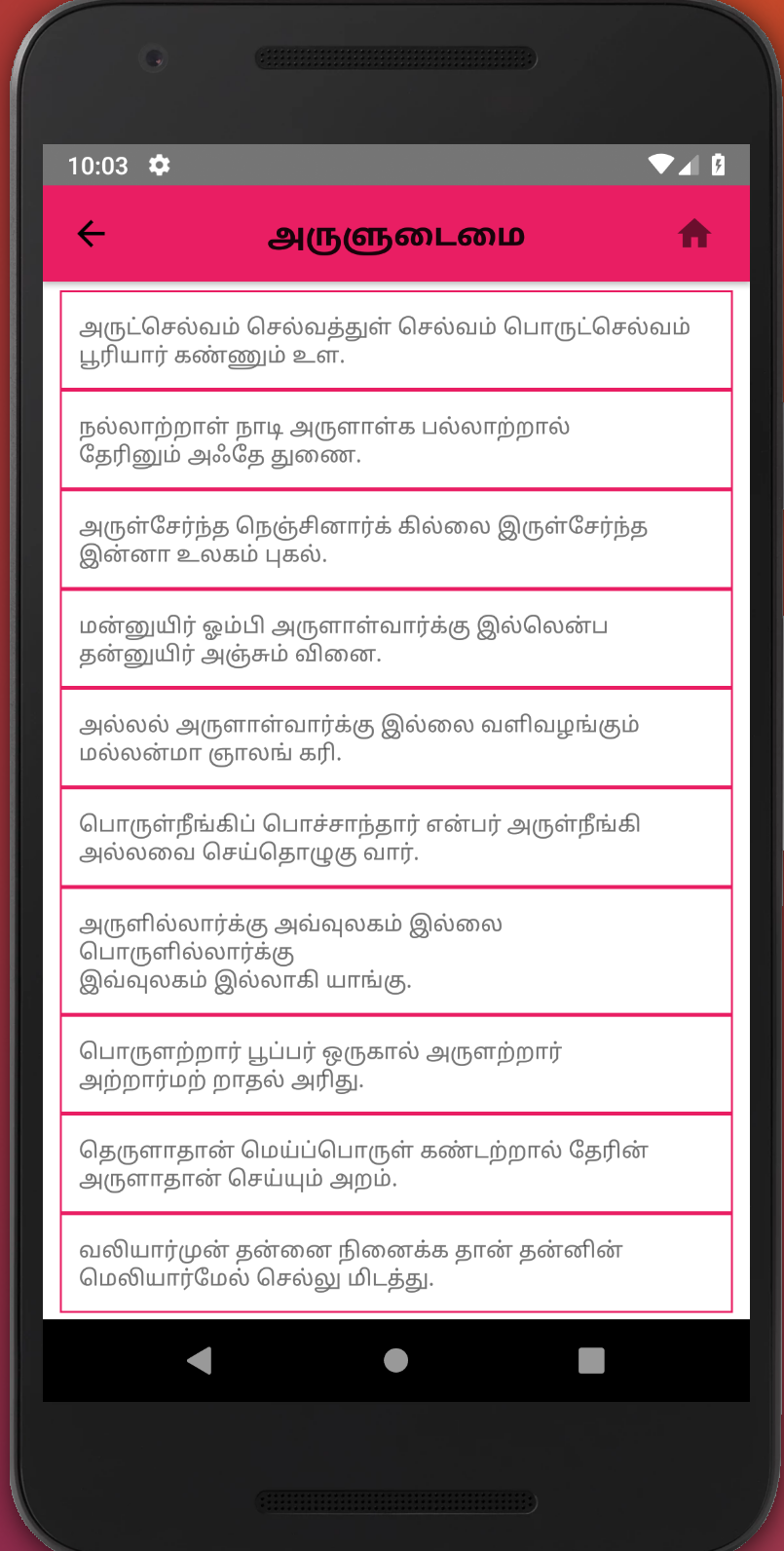 A simple react native app for Thirukkural (which is one of the oldest works in Tamil literature) written by Thiruvalluvar. The Tirukkural or shortly the Kural, is a classic Tamil text consisting of 1,330 couplets or Kurals, dealing with the everyday virtues of an individual.
