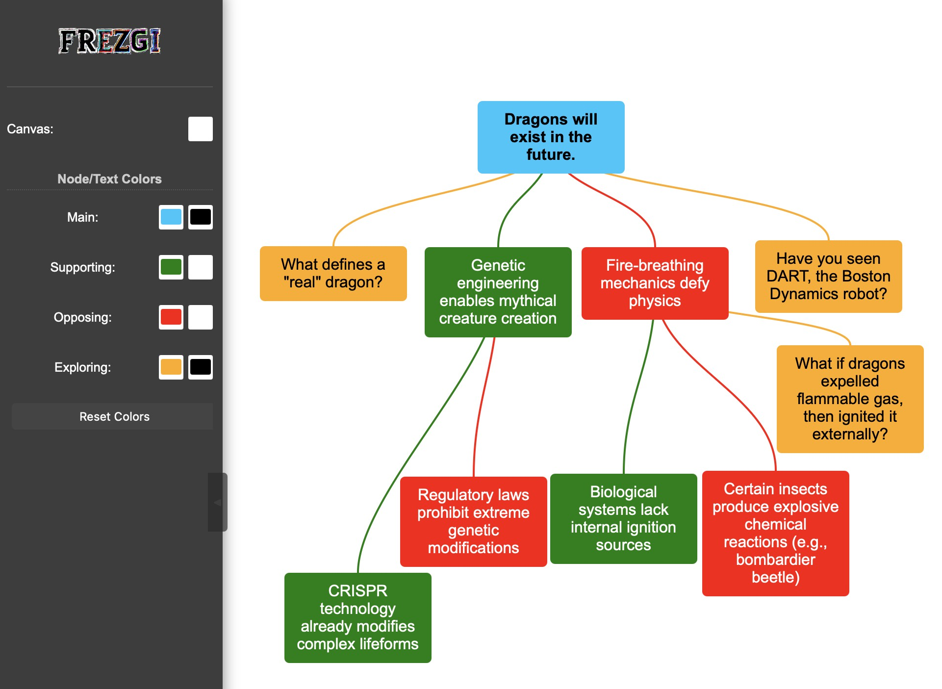 Frezgi is a visual argument mapping tool that helps you map out complex arguments and decisions using an intuitive, interactive interface. Create argument tries with supporting, opposing, and exploring nodes to better understand problems and make informed choices.