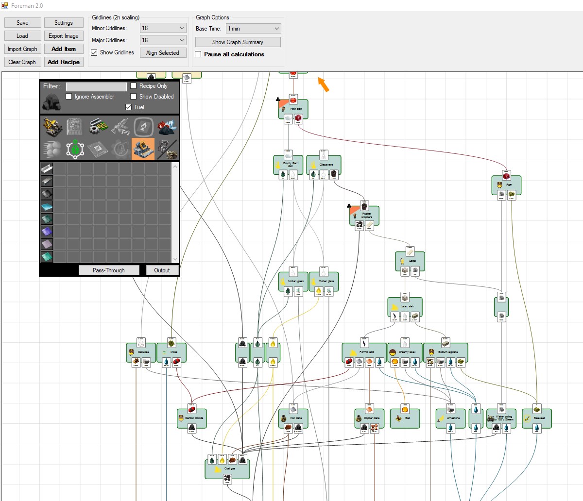 Additionally, be careful when exporting large graphs - this is a raster format instead of a vector one, so large graphs can quickly spiral out of control. It is highly recommended to plan out the factory in smaller sub-factories with a saved graph for each (that you can export as an image), and if you wish to plan the ENTIRE factory, then do so by importing the smaller graphs into the main graph, connecting all the nodes, doing your planning, and NOT exporting the final image (instead just saving the graph and navigating it within Foreman).