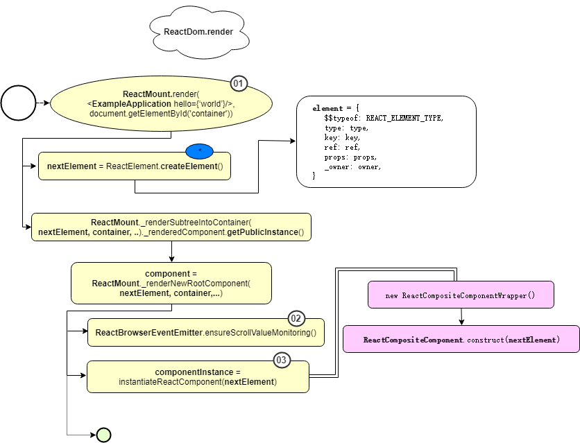通常 ReactDom.render 是整个 React 应用的入口,以 ReactDom.render(<ExampleApplication />, DOMNode) 为例,其内部执行过程如图: