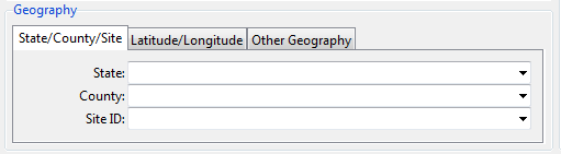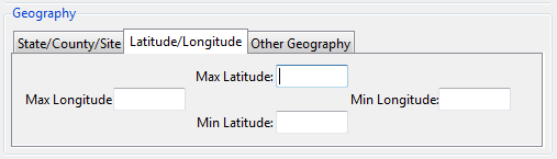 You can define a geographic bounding box from this tab. There are restrictions on how large a bounding box can be. Refer to AQDM Query Limits for more information.