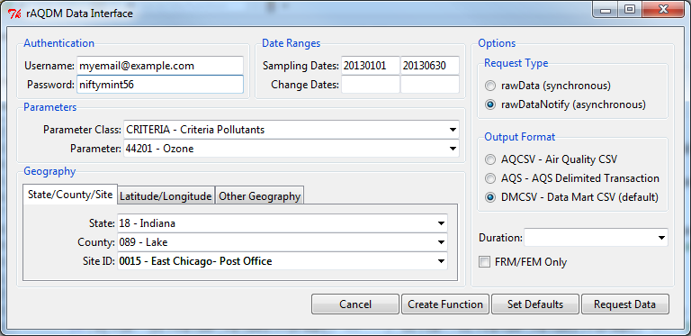 param = "44201", frmonly = TRUE)In this example we set defaults for username, password, param, and frmonly. Any request you make can skip these parameters and raqdm will insert them for you and any time you open the GUI these parameters will be entered by default.
