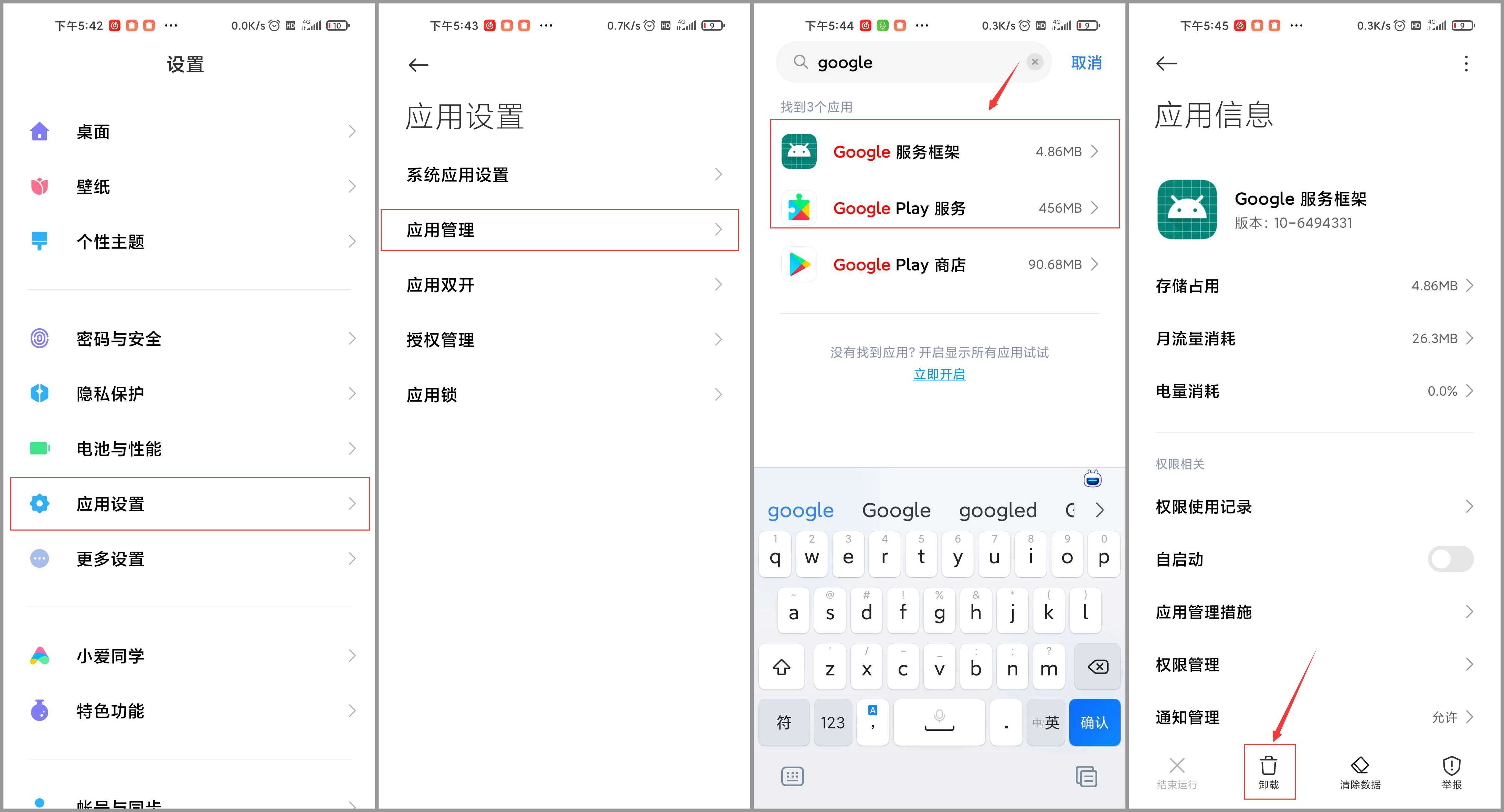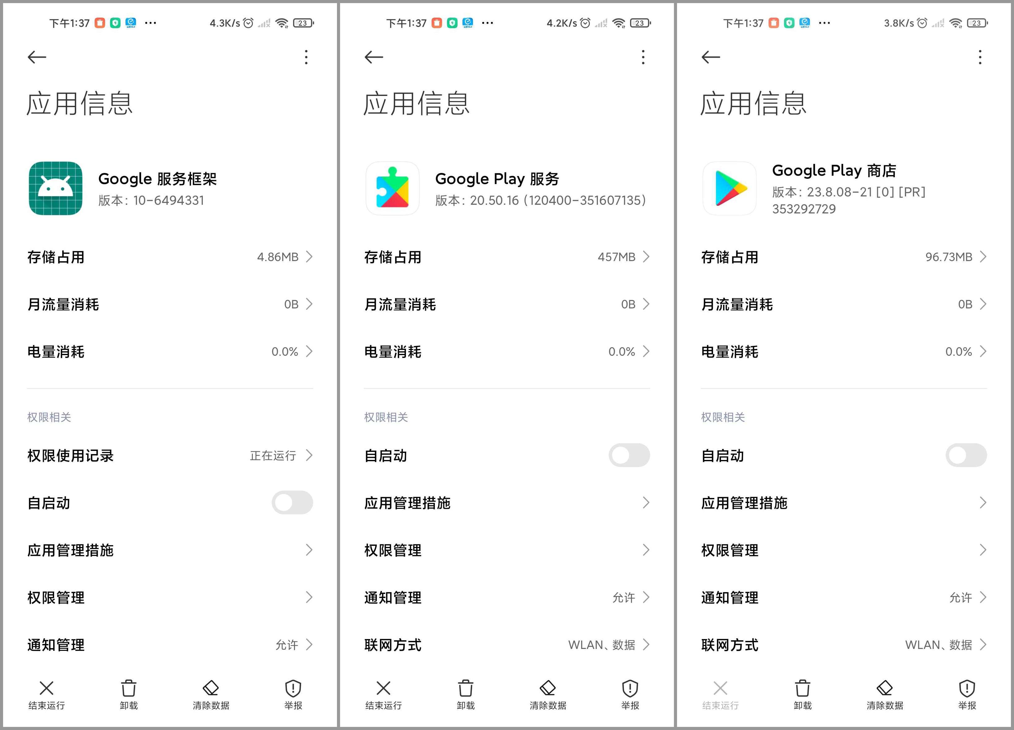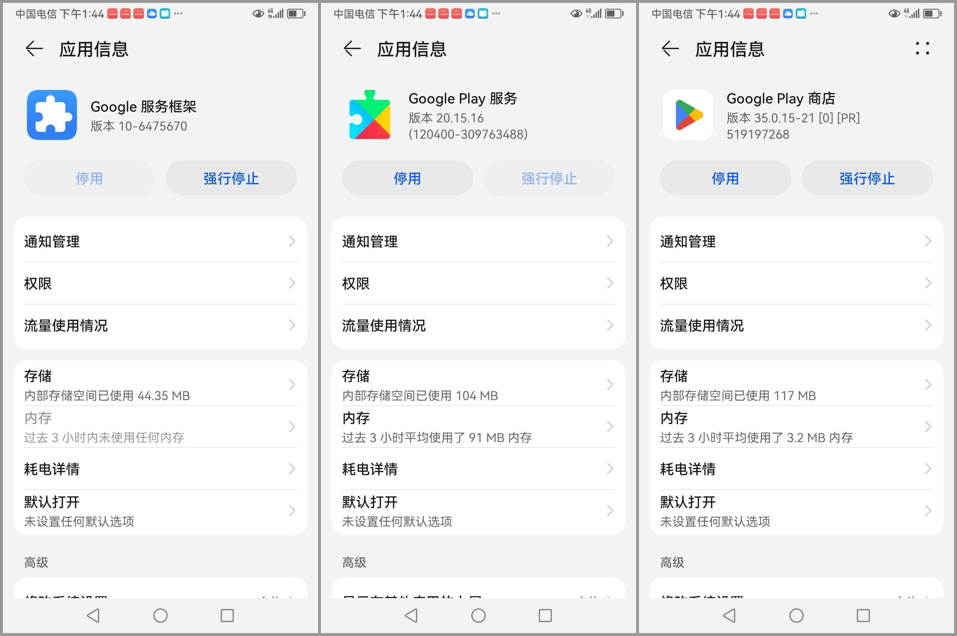 但是另外两个谷歌服务框架、谷歌Play框架是在后台运行的,在应用管理中点击卸载即可。