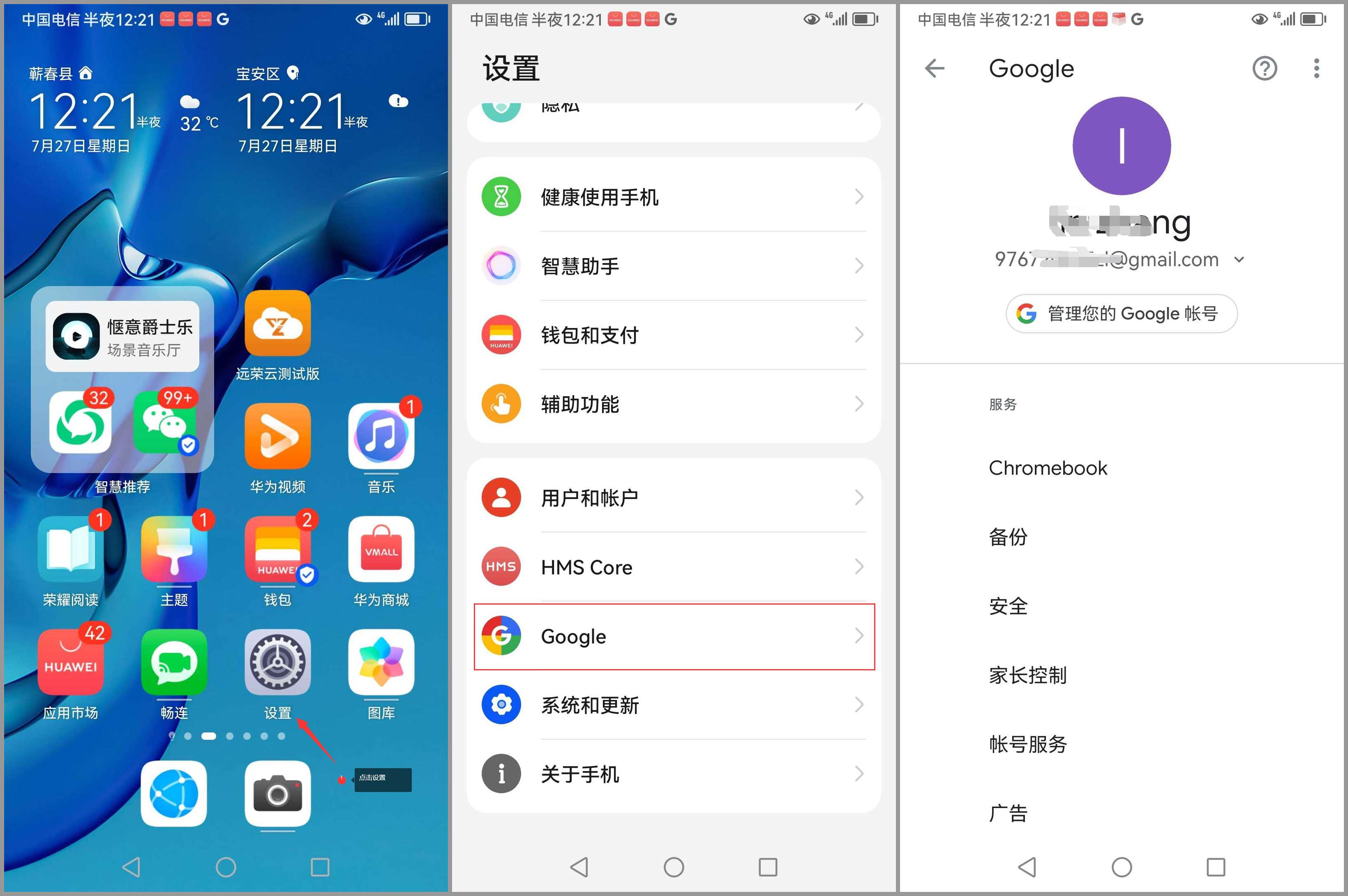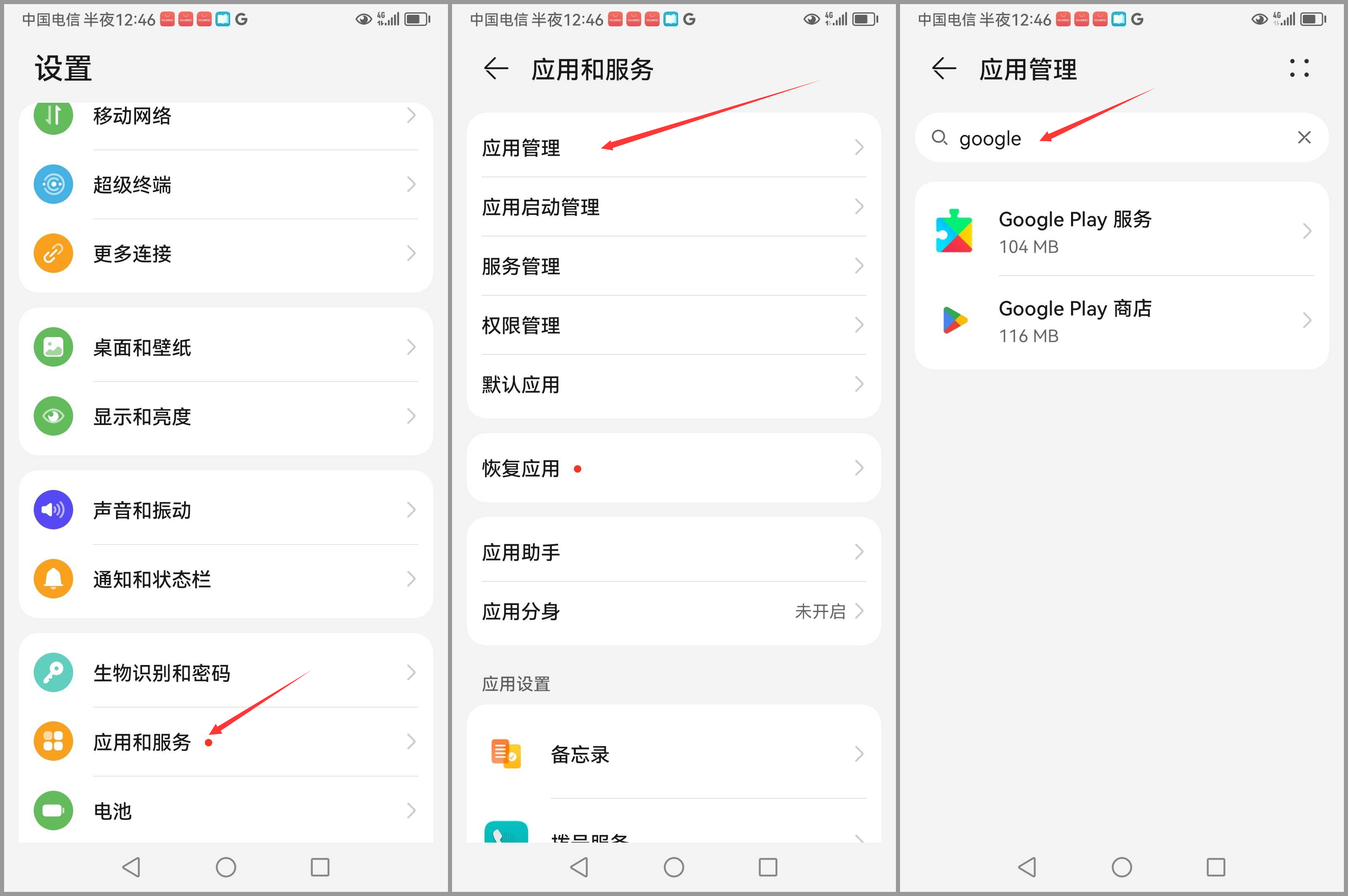 自带三件套,点击【设置】>【更多设置】>【应用设置】,然后搜索“google”