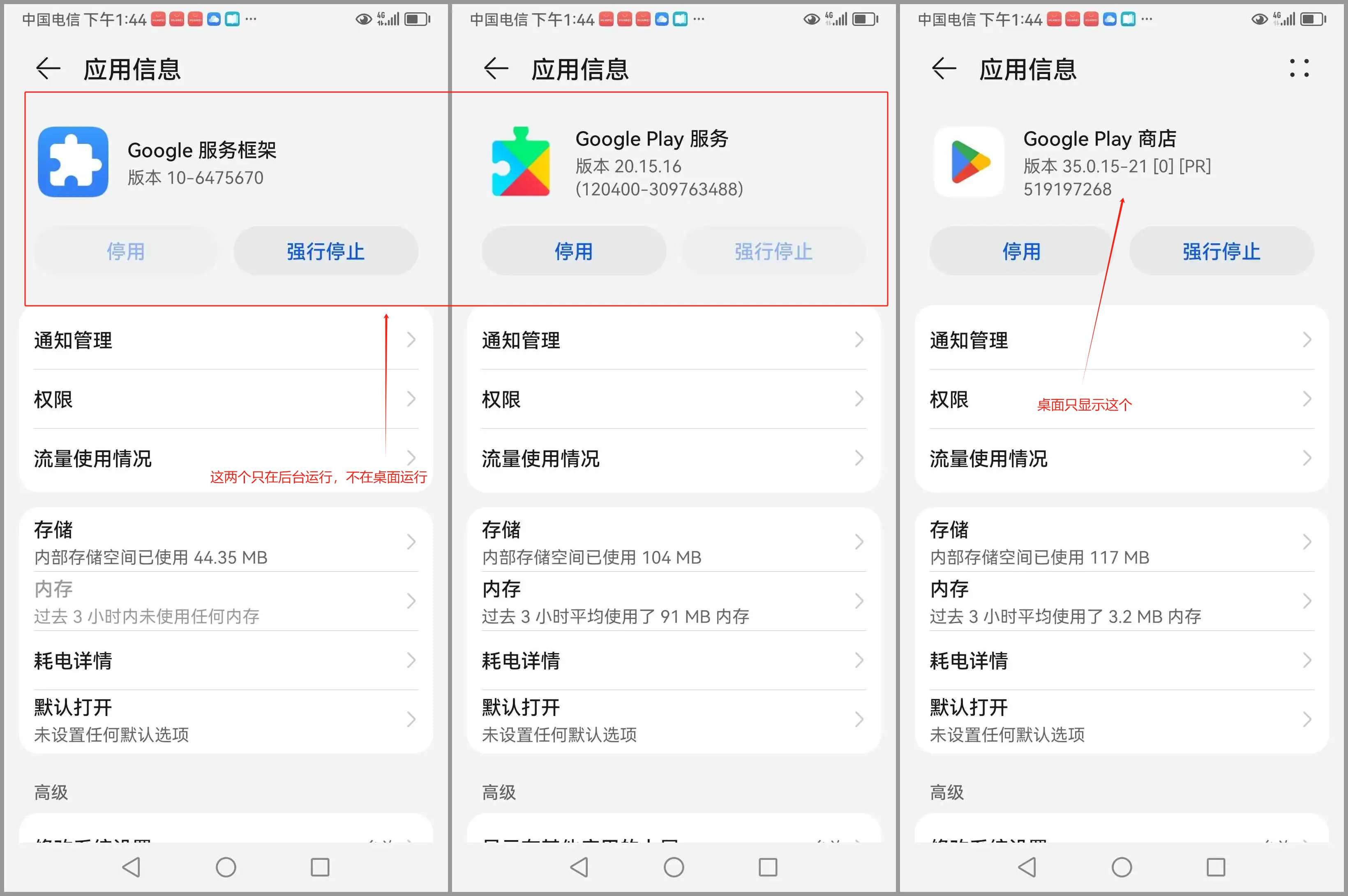 这里必须解释一下:Google 服务框架、Google Play服务只是在后台运行,只有商店在桌面显示。
