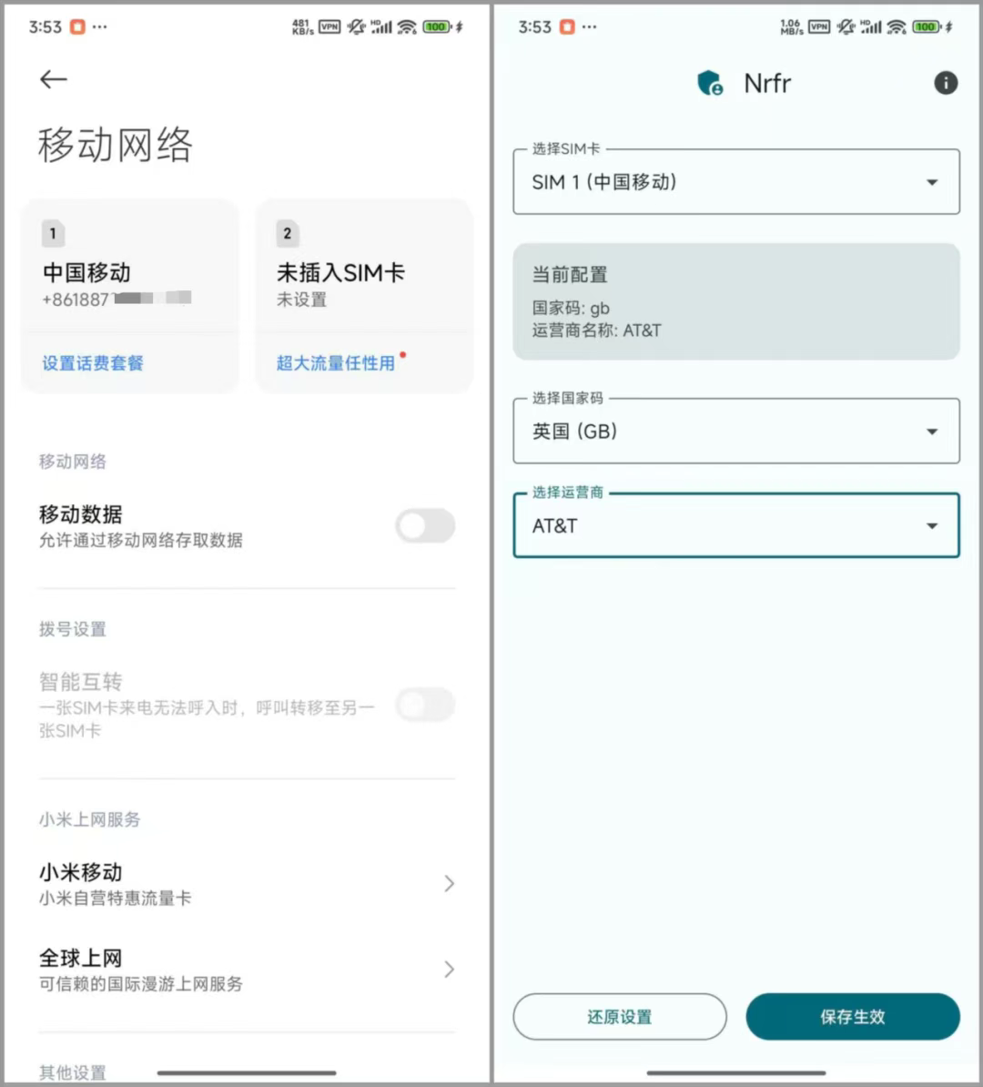 2、不拔卡,使用Shizuku+Nrfr 修改国内SIM卡的国家码为US;