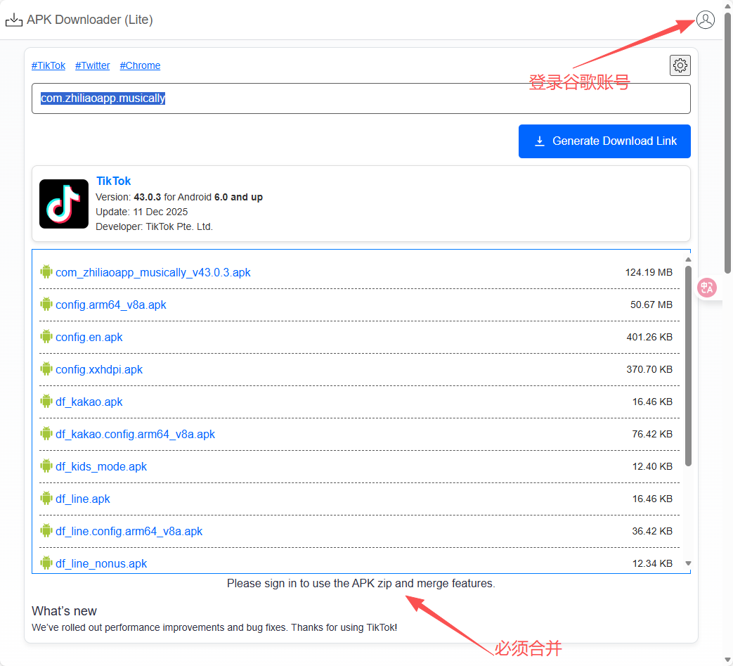 必须重点提醒,用上面的2个apk下载网站直接下载谷歌商店的Tiktok,是需要登录谷歌账号进行合并apk才能使用的。