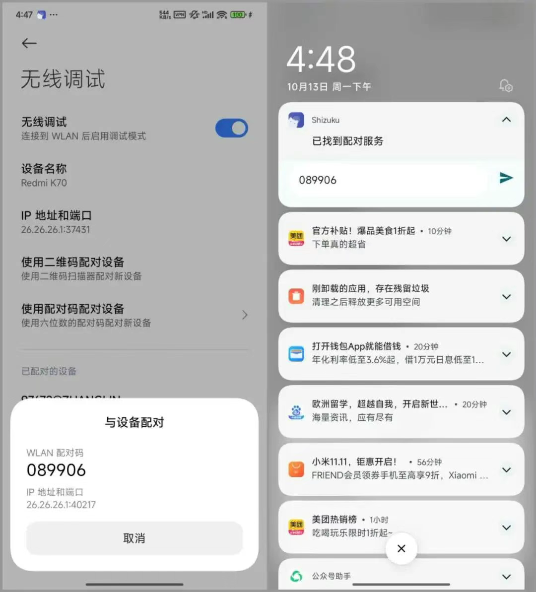 在通知栏上输入配对码,成功配对才能启动Shizuku。