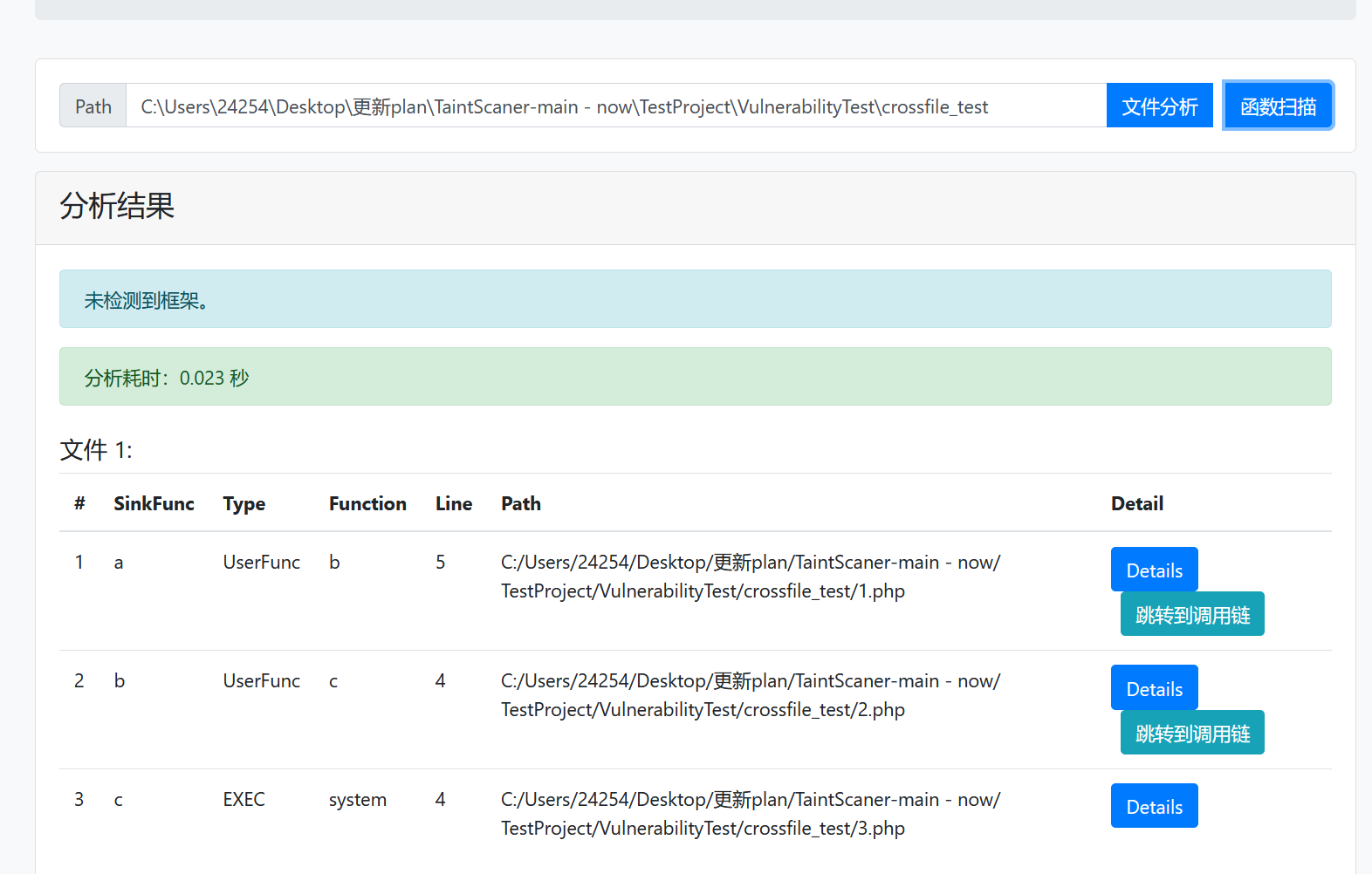 可以看到我们扫描出来了三个新Sink:a、b和c,我们点击函数a右边的跳转到调用链按钮就可以跳转到调用链: