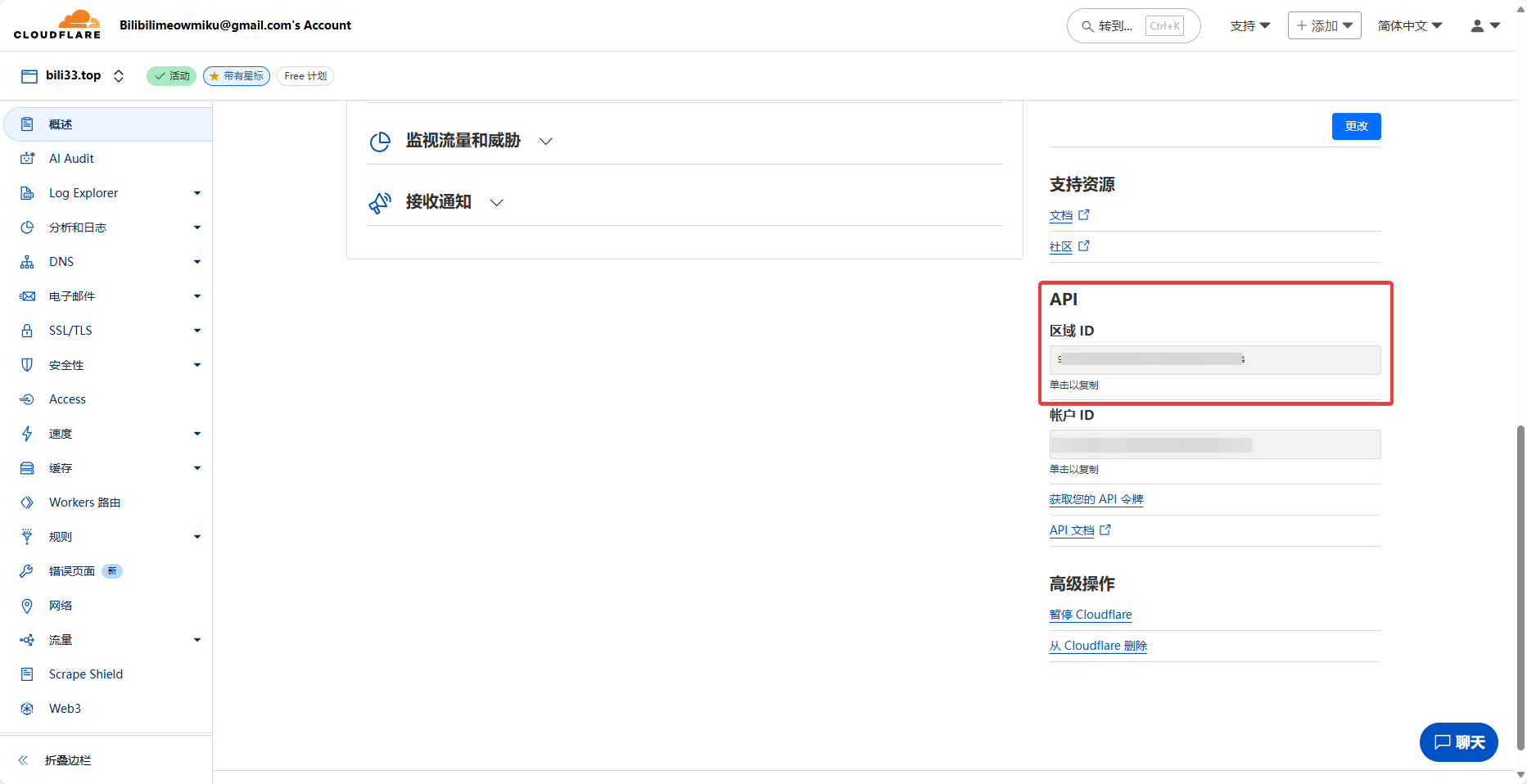 zone_id 是你的 Cloudflare 的区域 ID,在域名的概览下就有