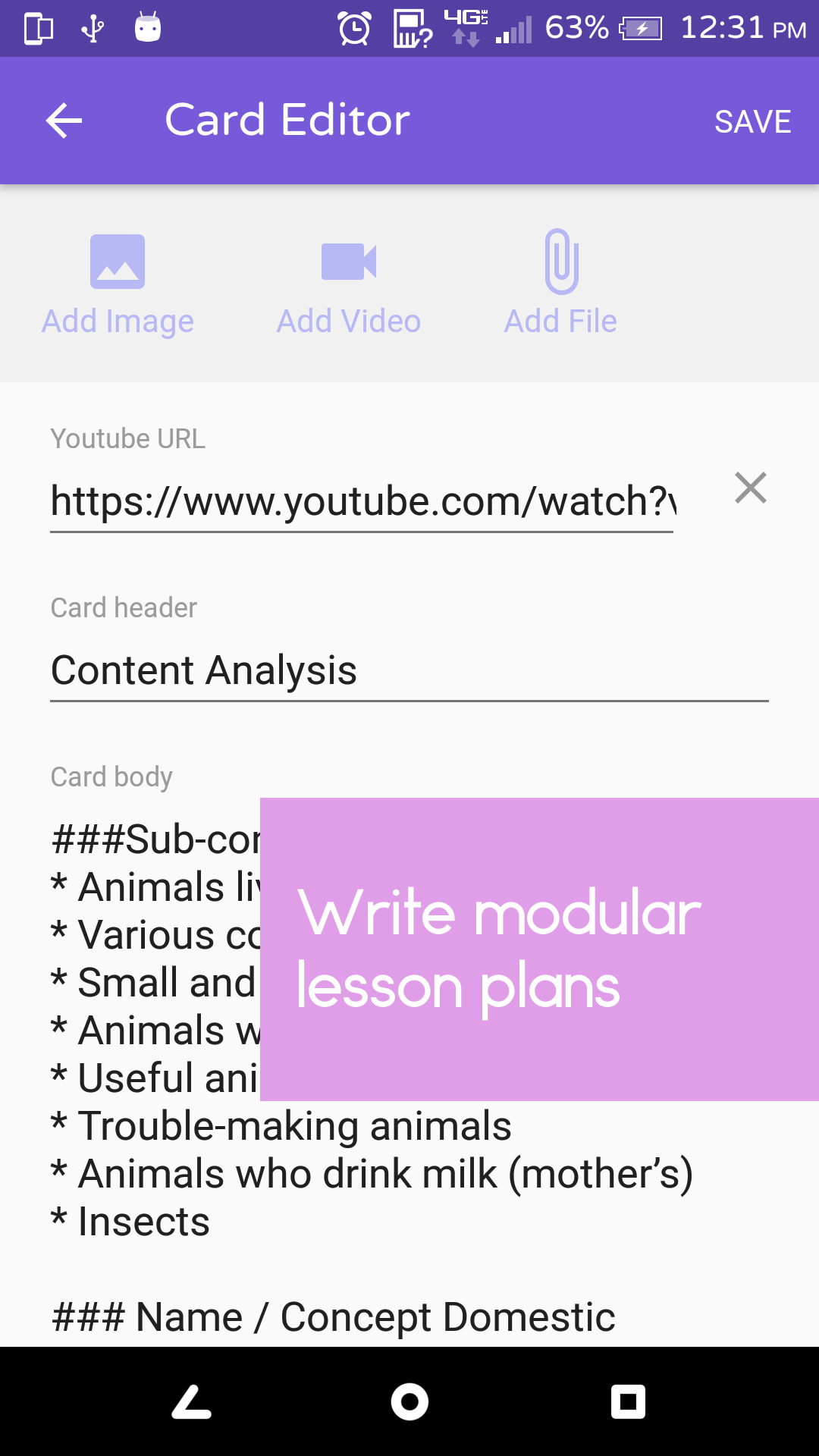 Lesson plans for a given topic can be written by any teacher and submitted through the app.