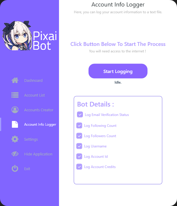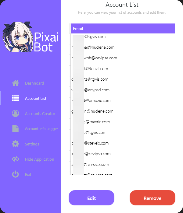 If the user does not choose a proxy, accounts will be created with a 5-minute interval. This is a cooldown imposed by Pixai for creating new accounts. After creating the account, it will be automatically added to the account list. You can see the account login details in the account list tab.