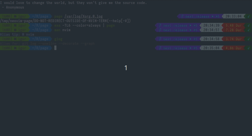 Bonus: another binary named nv is included, which reimplements neovim-remote but with interface similar to page. There's no intention to have all nvim --remote features — it should be only a simple file picker that prevents spawning nested neovim instance. Also, in contrast with neovim-remote there are some safeguards e.g. it won't open non-text files unless explicit flag is provided for that so nv * opens only text files in current directory. I recommend to read --help output and experiment with options a bit.
