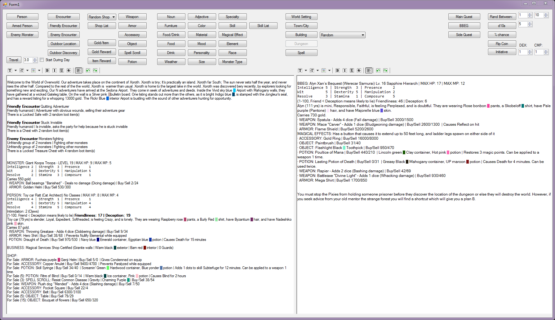 The randomizer uses a json file with a massive list of names, nouns, adjectives, magical effects, etc to randomize from. The system pulls weighted values from this list when you ask it to. the GM will have to pull from those options to create the world, for example as you enter a town the GM may click the building button to generate several businesses. When entering, they can then create an armed person as a guard, a shopkeeper, and a list of sold items.