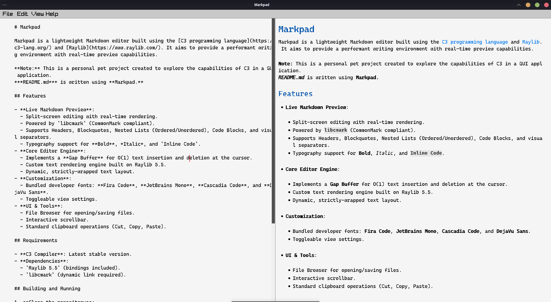 Markpad is a lightweight Markdown editor built using the C3 programming language and Raylib. It aims to provide a performant writing environment with real-time preview capabilities.