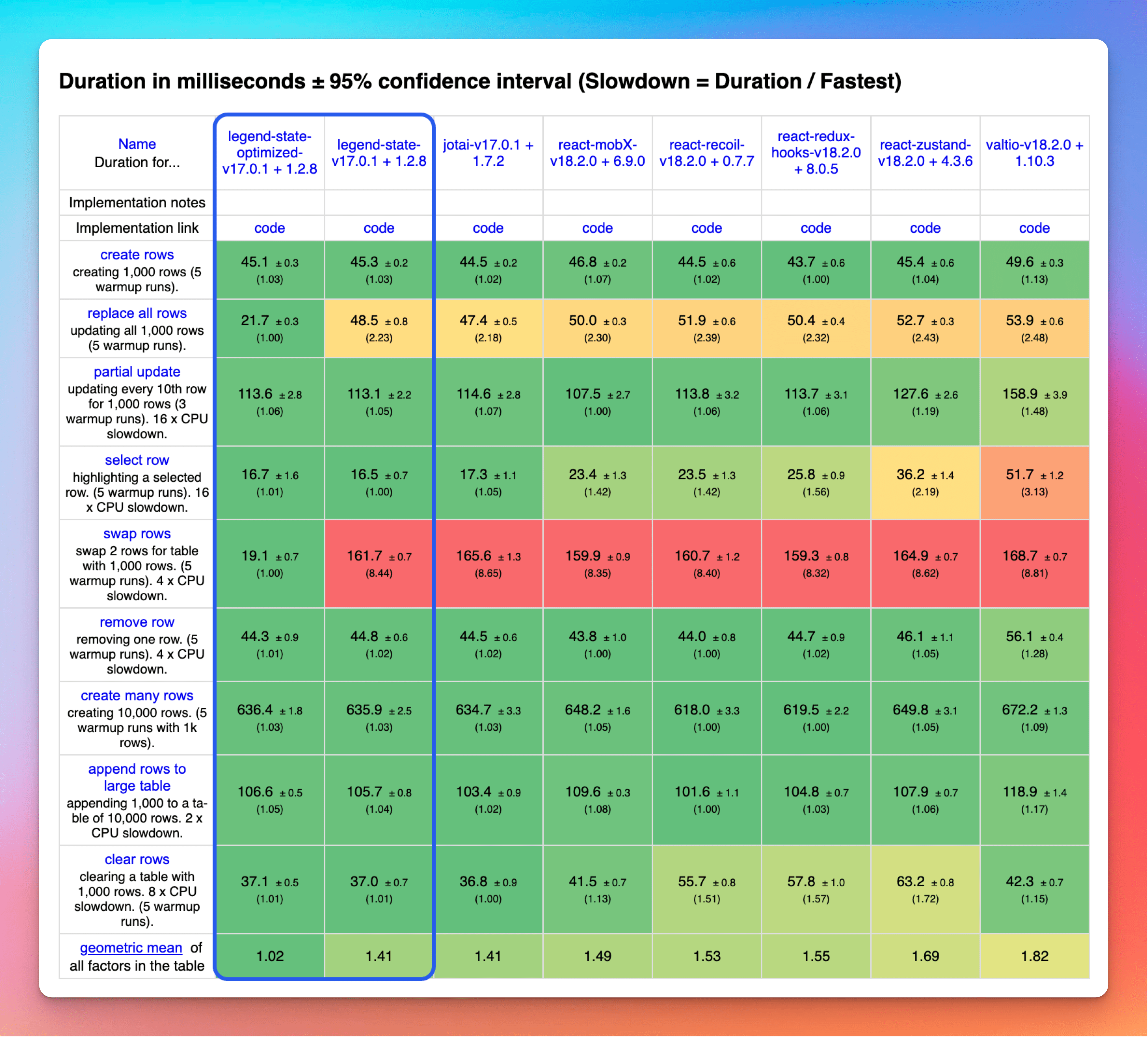})Legend-State beats every other state library on just about every metric and is so optimized for arrays that it even beats vanilla JS on the "swap" and "replace all rows" benchmarks. At only 4kb and with the massive reduction in boilerplate code, you'll have big savings in file size too.