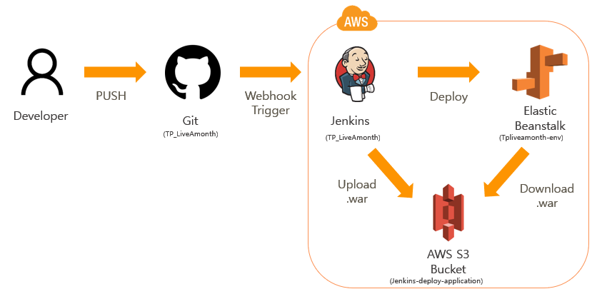 - 젠킨스, AWS S3 Bucket을 사용해 자동 빌드, 배포 환경을 구축했으며 이로 인해 개발자는 직접 서버 환경에 애플리케이션 코드를 올리지 않아도 Github에 코드만 Push해 애플리케이션을 배포했습니다.