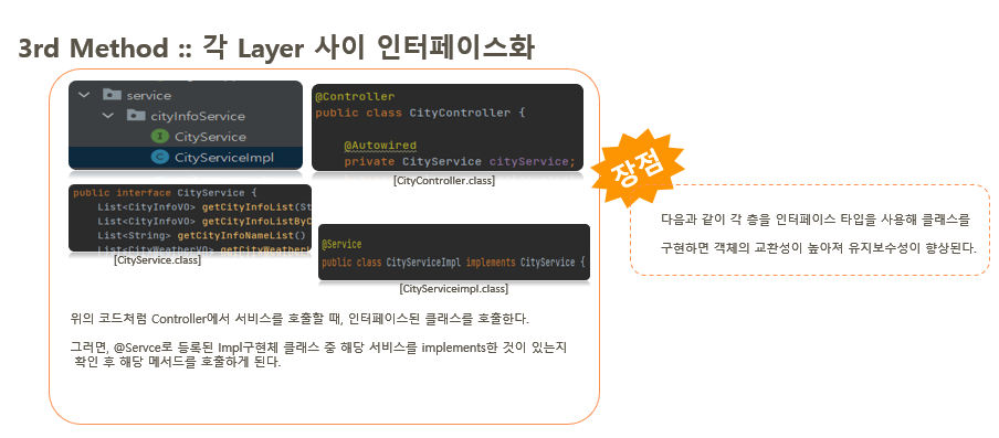 - 각 계층 사이 인터페이스 타입을 사용했습니다.