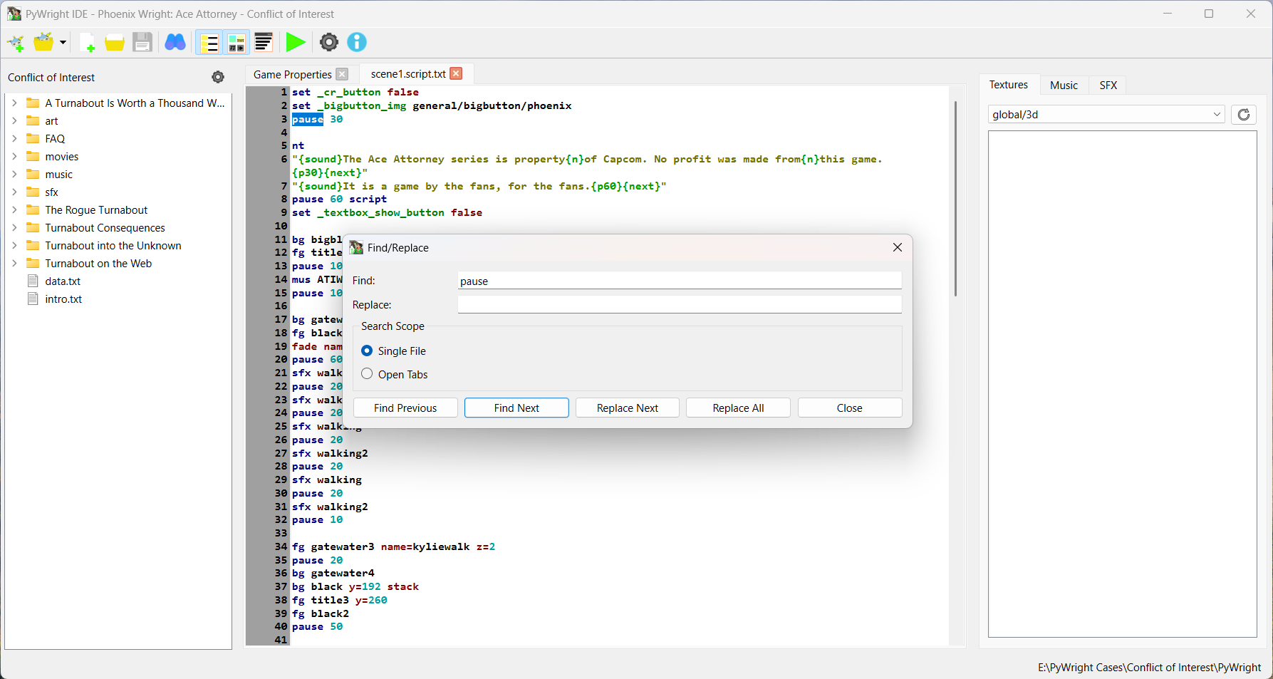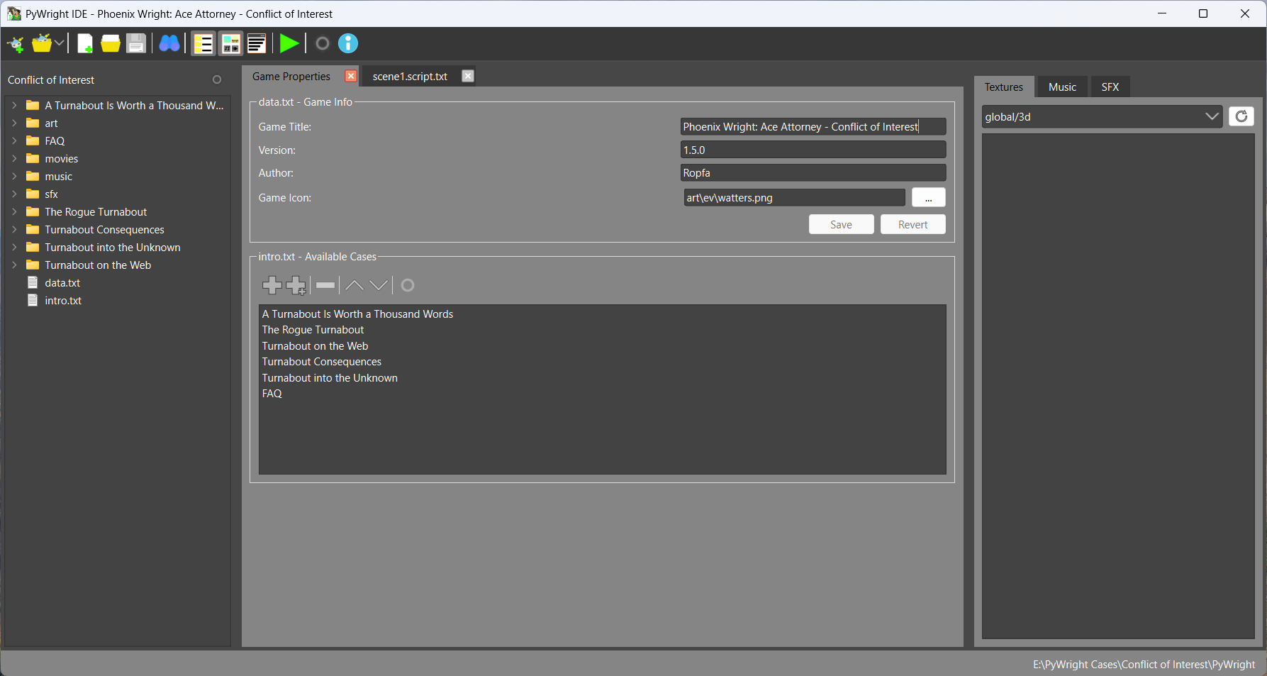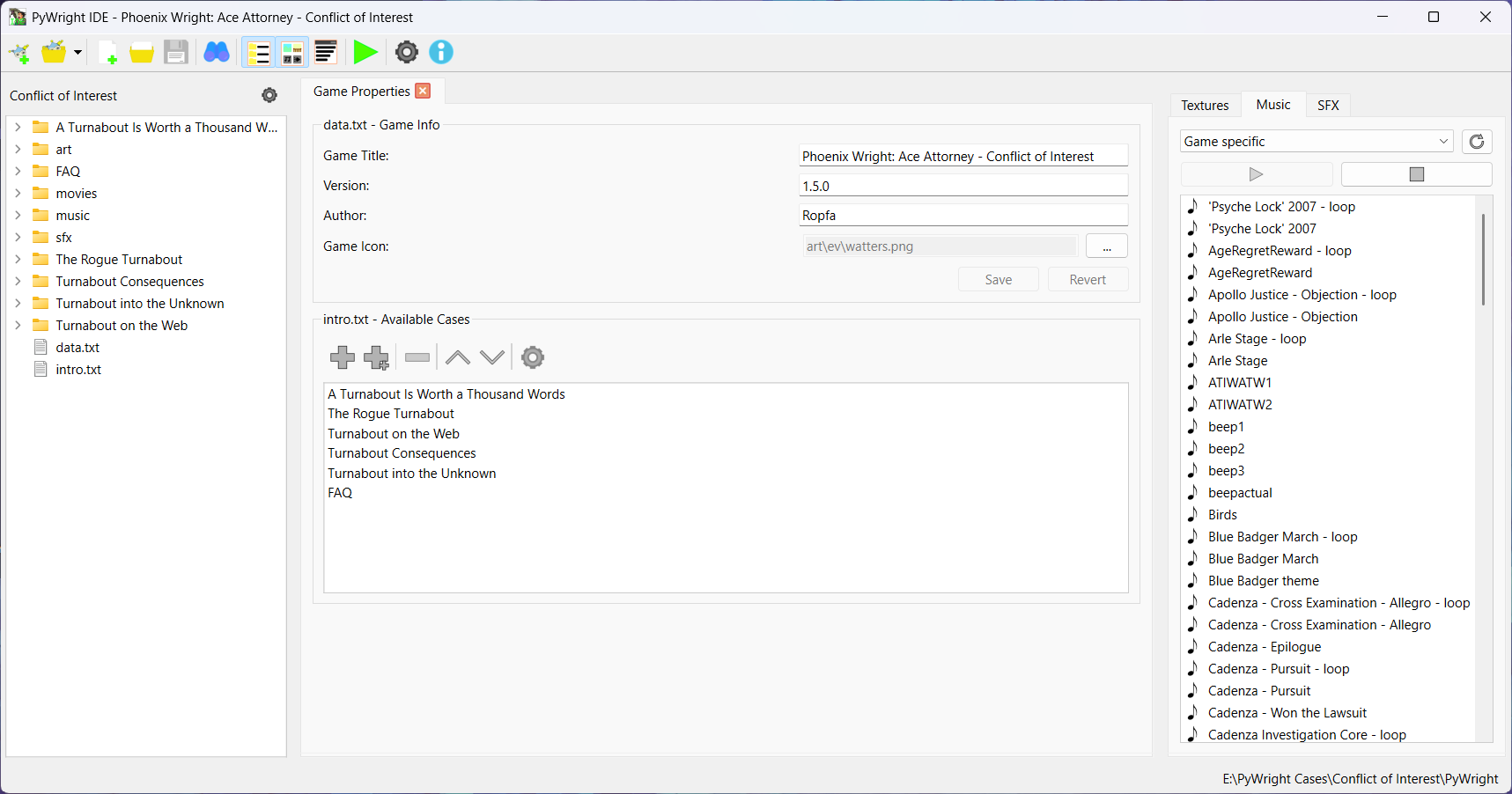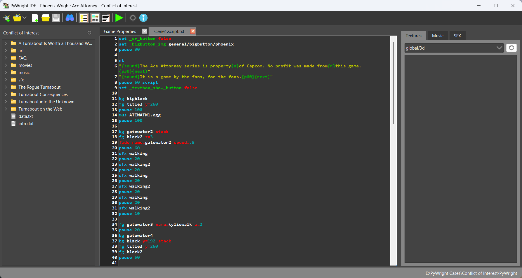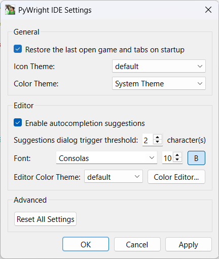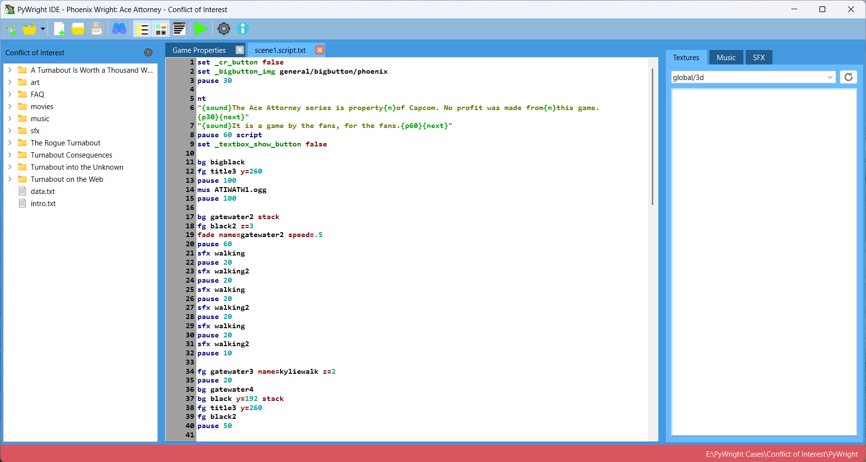 This project is a simple IDE written in Python and PyQt, that aims to make developing PyWright games easier. It features a tabbed text editor with syntax highlighting, dialogs to create new or interact with games/cases, and asset browsers.