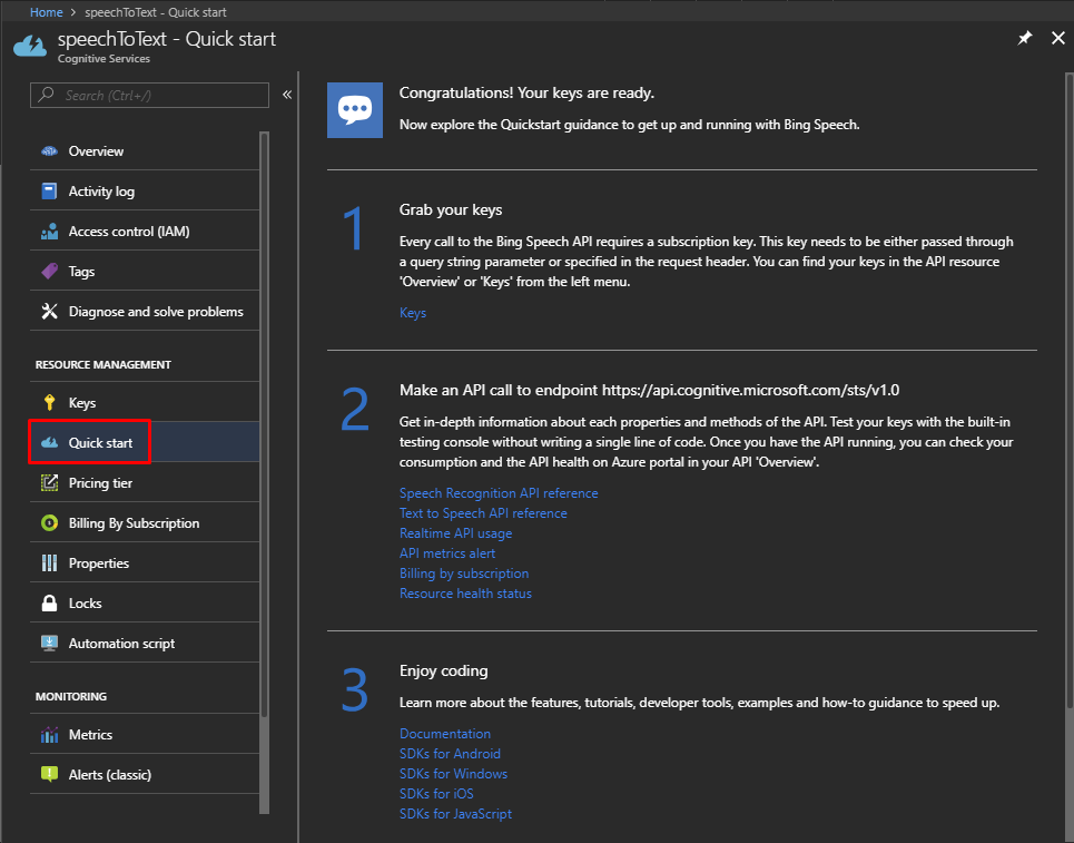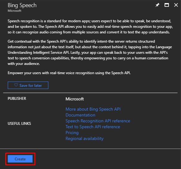 - Clique no botão Criar na parte inferior do painel do serviço de Fala.