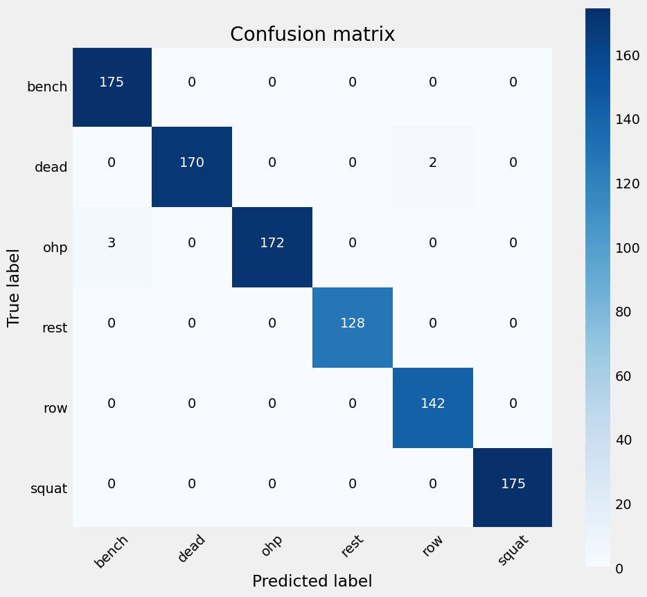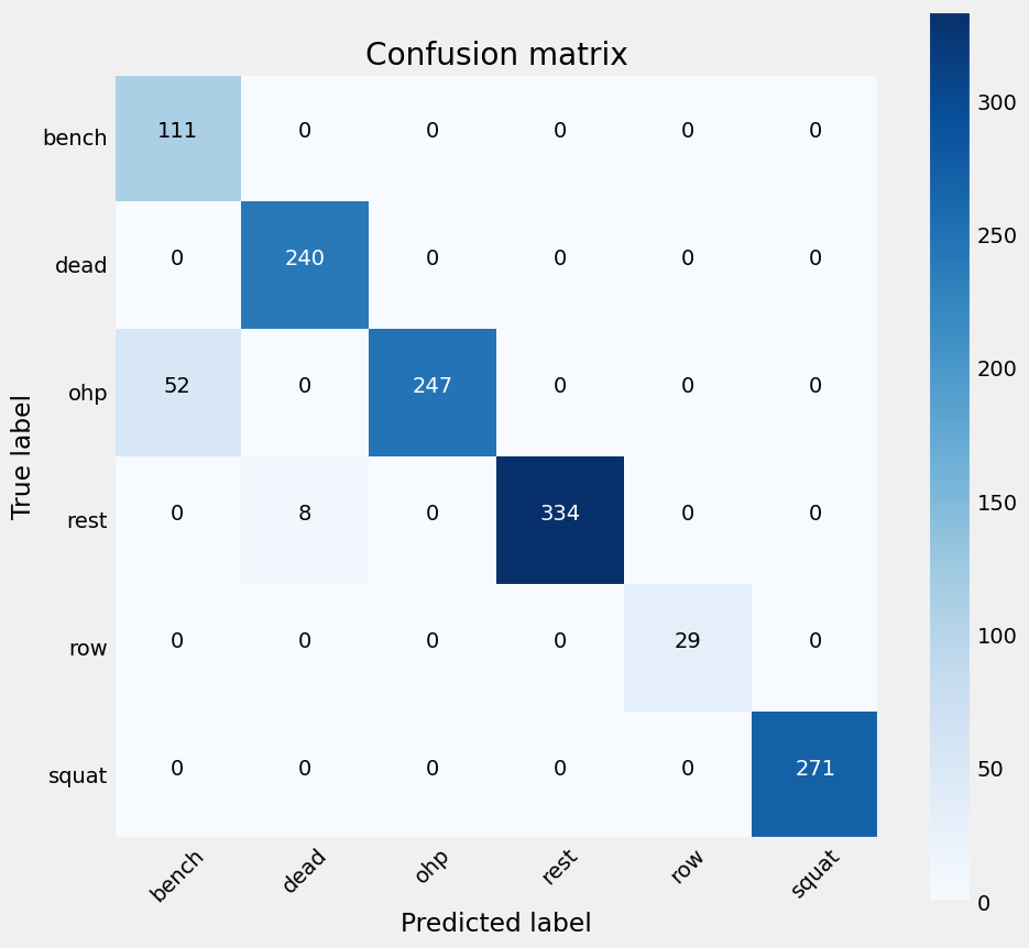 Figure 25: Confusion Matrix for the Neural Network model,showing an increased discrepency in classifying OHP and deadlifts when compared to Figure 23.