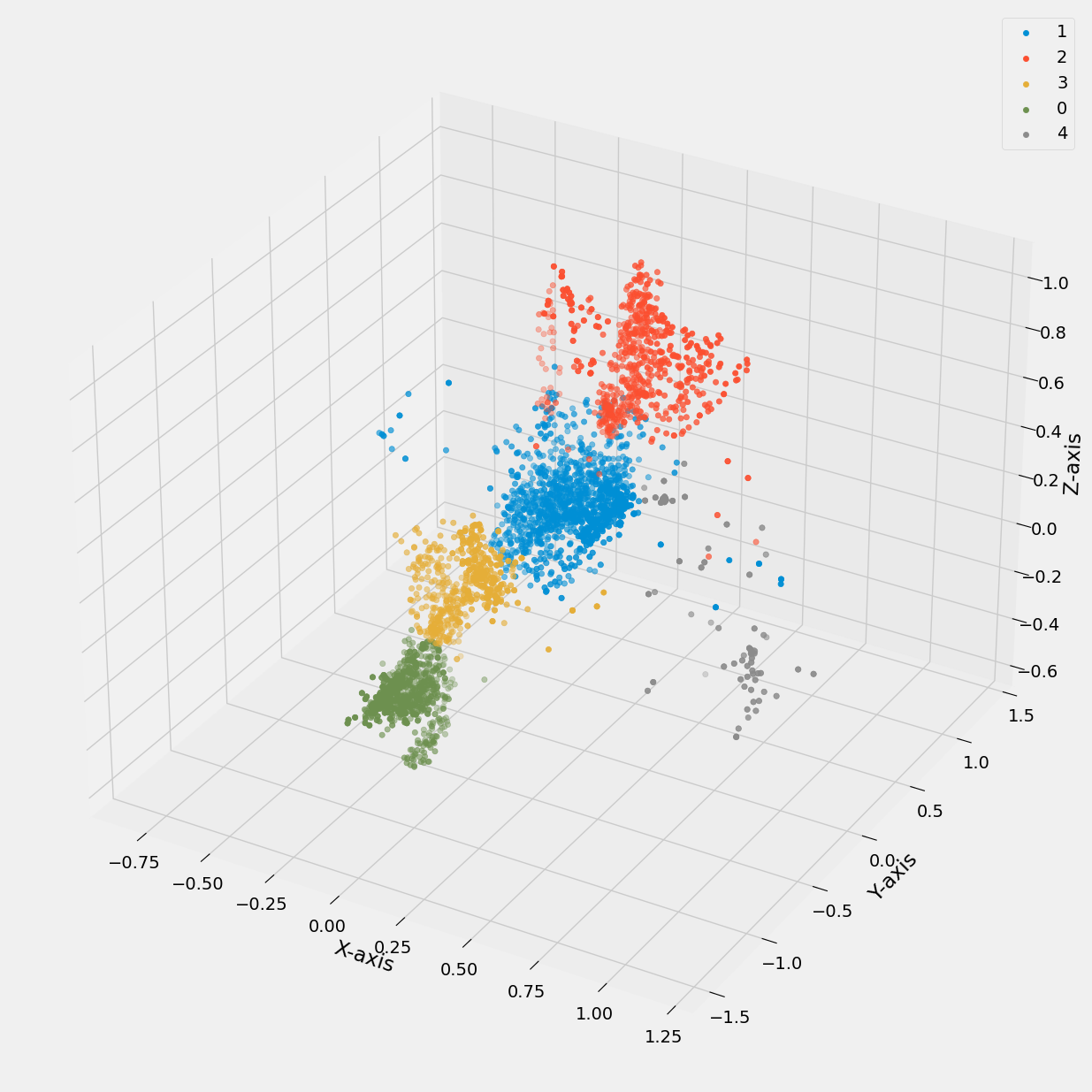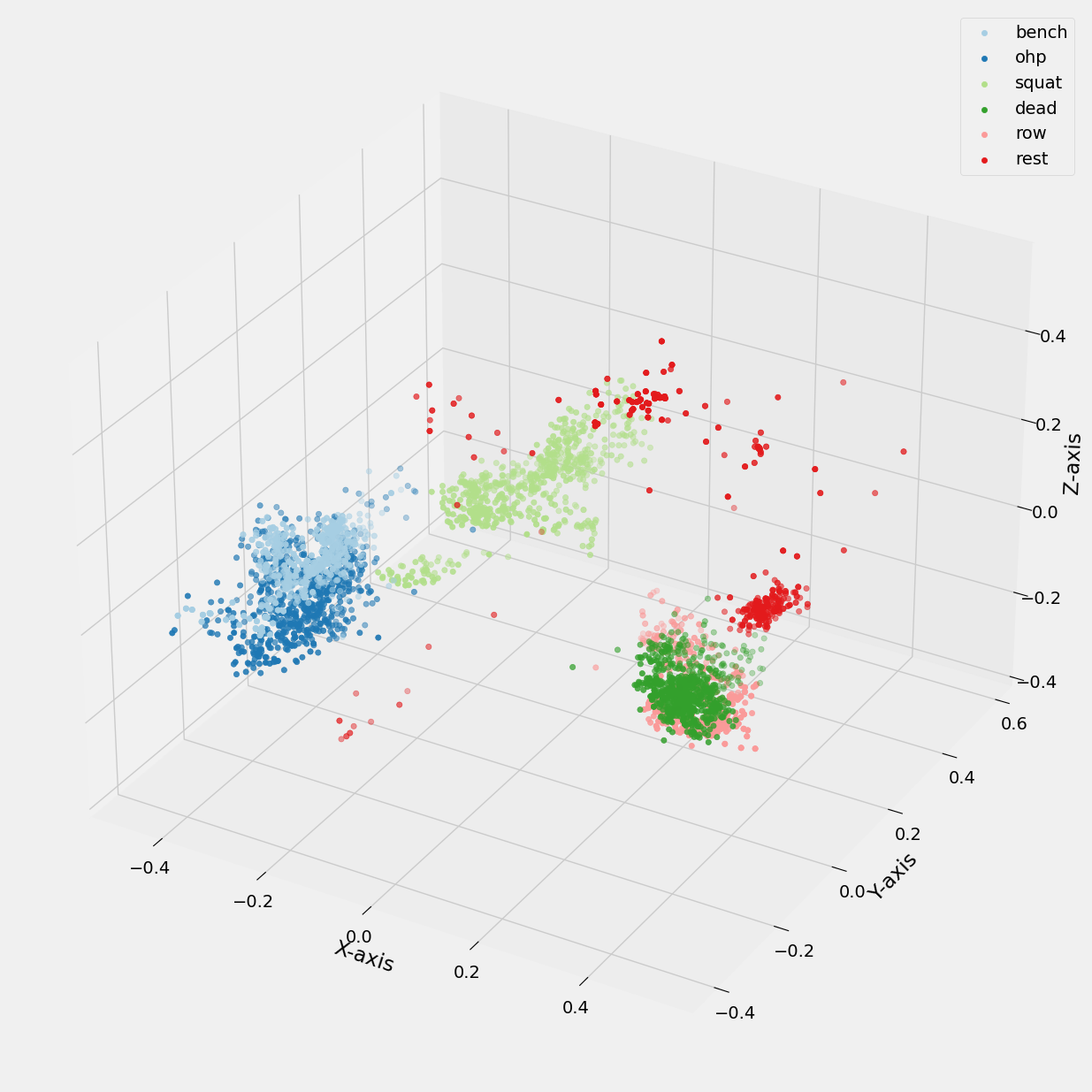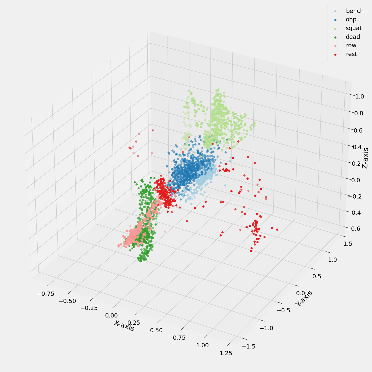 Figure 18: 3D scatter plot of accelerometer data vs Exercise Labels.