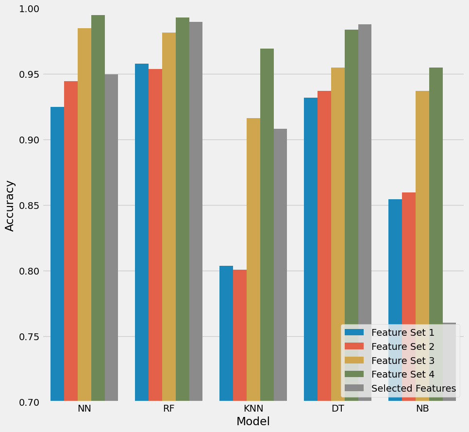 Referencing figure 22, we can observe how in almost all instances Feature_set_4 out perfoms all other features sets. NN and RF models seem to return the greatest accuracy for this feature set (>0.99).