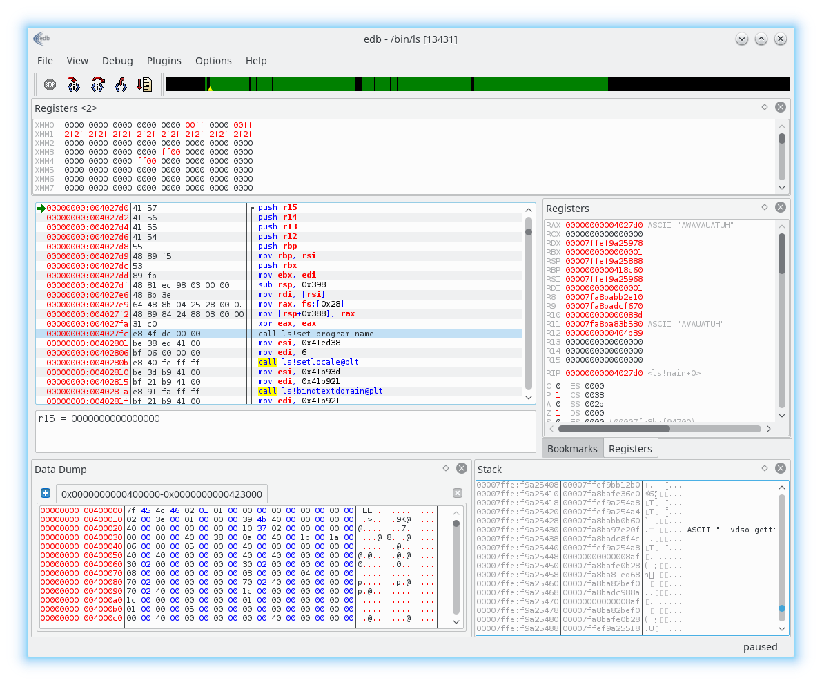 edb is a cross platform x86/x86-64 debugger. It was inspired by Ollydbg, but aims to function on x86 and x86-64 as well as multiple OS's. Linux is the only officially supported platform at the moment, but FreeBSD, OpenBSD, OSX and Windows ports are underway with varying degrees of functionality.