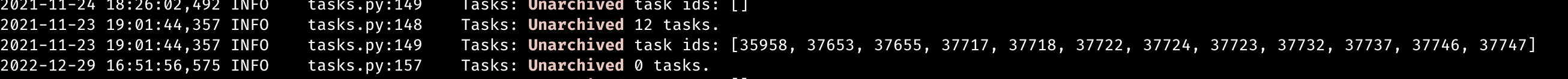 | logger.info(f"Tasks: Archived task ids: {task_ids}") | ||