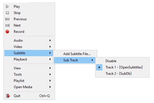 Opening the video file in VLC player will automatically load the subtitle files as below