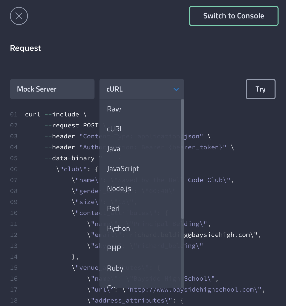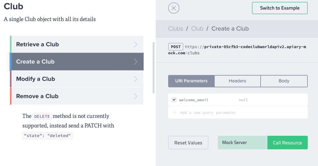 You'll see a test URL near the top on the right (https://private-xxxxx-codeclubworldapiv2.apiary-mock.com/clubs). You can use this URL for mocking calls (ie. replace the value of CCW_API_URL in the theme's inc/country-config.php with that Apiary URL, minus the /club portion). Firing off calls to the mock server will return responses such as the following on club creation: