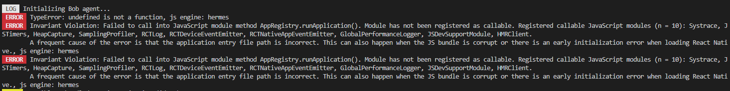 Khi em run-android thì terminal metro hiện lỗi như ảnh dưới, em nghĩ vấn đề ở hàm nào đó ở trong function initializeBobAgent ở trong file getNewAgent.js trong folder agentSetup