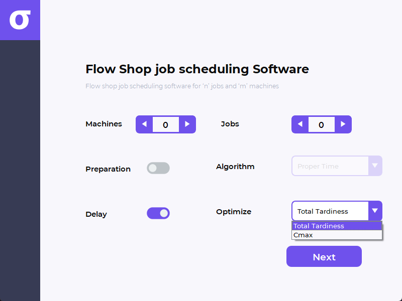 Sigma is a tool that allows to calculate the Makespan, the Tardiness and the Sequence of a flow-shop optimization problem of n jobs and m machines, taking in consideration the setup time and the due dates.