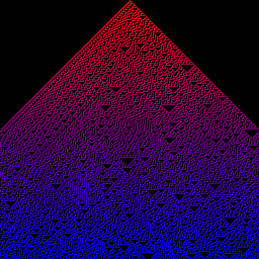 Rule 30 for 256 cells in 256 generations with dead cells in black and a linear interpolation from red to blue for the living cells: