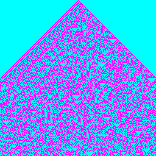 Rule 30 for 256 cells in 256 generations with living cells in pink and dead cells in turquoise: