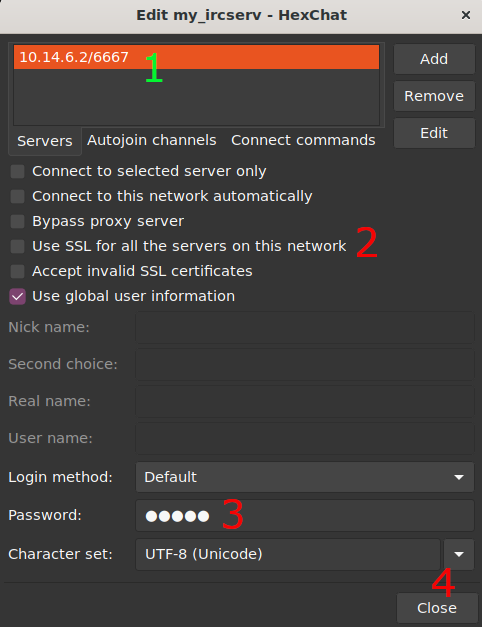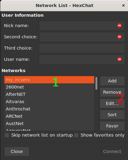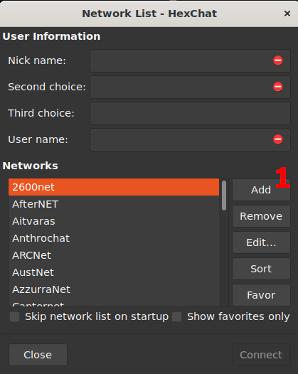 Open HexChat. In the Network List (prompted automatically), add a new network (1).