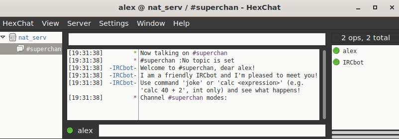 JOKEorCALC 5+5), the bot replies viaPRIVMSG. JOKE: Returns a random joke from a predefined set of ten.CALC: Solves the mathematical expression provided as argument(s); spaces are allowed.