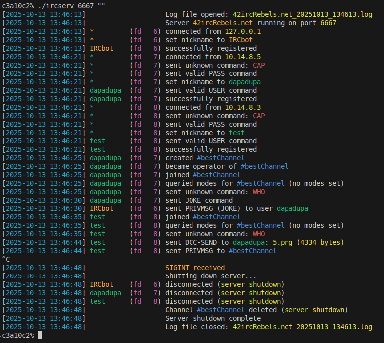 make bot: Have a bot join the server! Learn more about the bot here.make clean: Removes all the compiled object files (.oand.dfiles) and the obj directory.make clean_log: Removes all generated log files from the project’s root directory.make fclean: Performs a full cleanup by removing object and log files + theircservexecutable.make re/make re_bot: A shortcut that runsfcleanand thenall/botto rebuild the project from scratch.make checkout_os: Prints the detected operating system to the console.