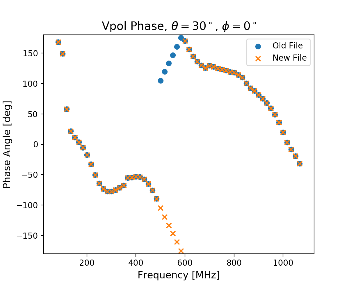ARA_bicone6in_output.txtandARA_bicone6in_output_updated2016.txtfiles. For some reason phases with value <=-100 degrees end up losing their negative sign (e.g. -99 is okay, but -101 becomes 101 instead). It's not clear to me why this happens, but it is evident by plotting the phases for a given angle across frequencies (see plot below).I fixed the phases in