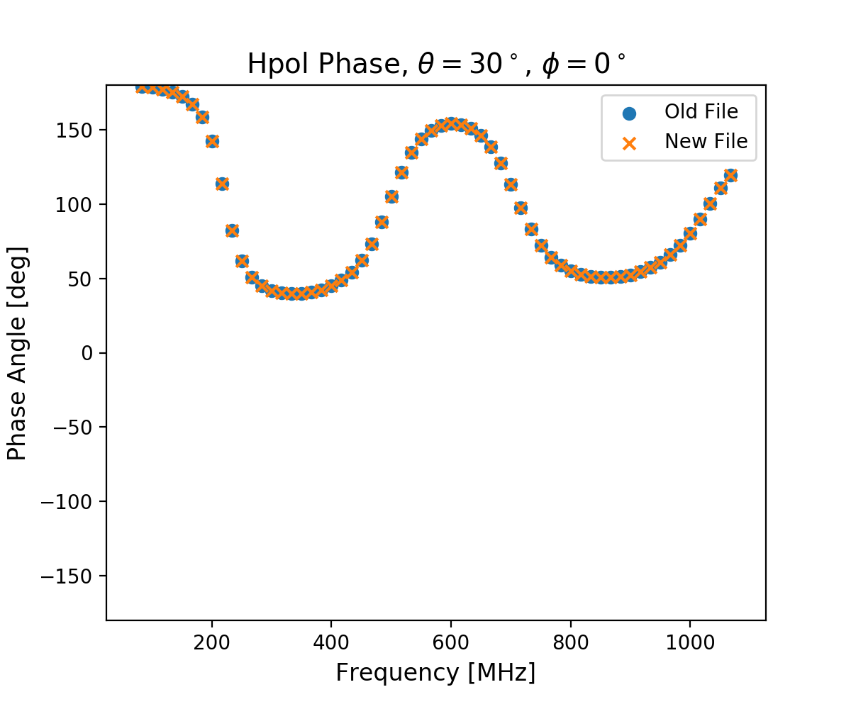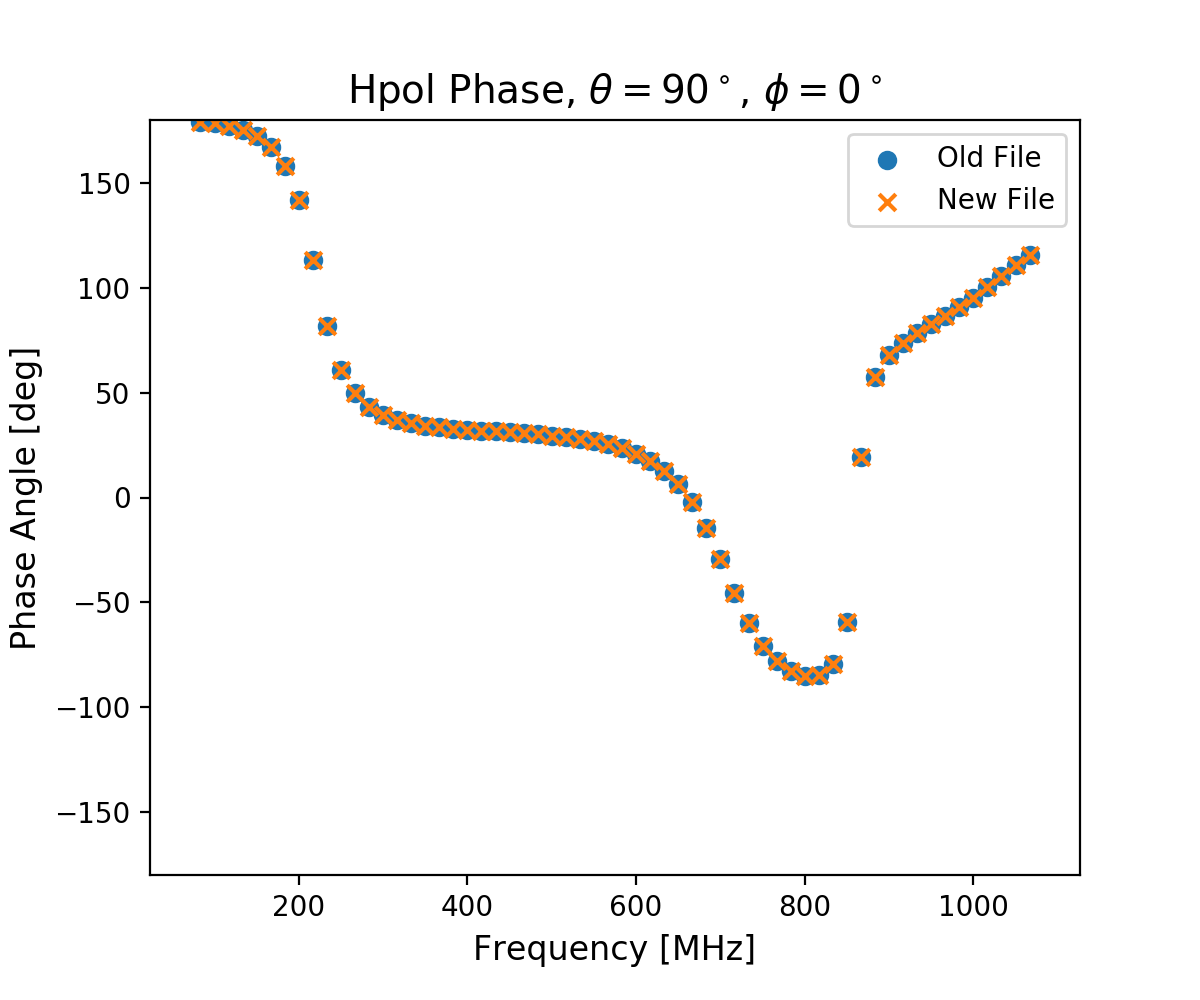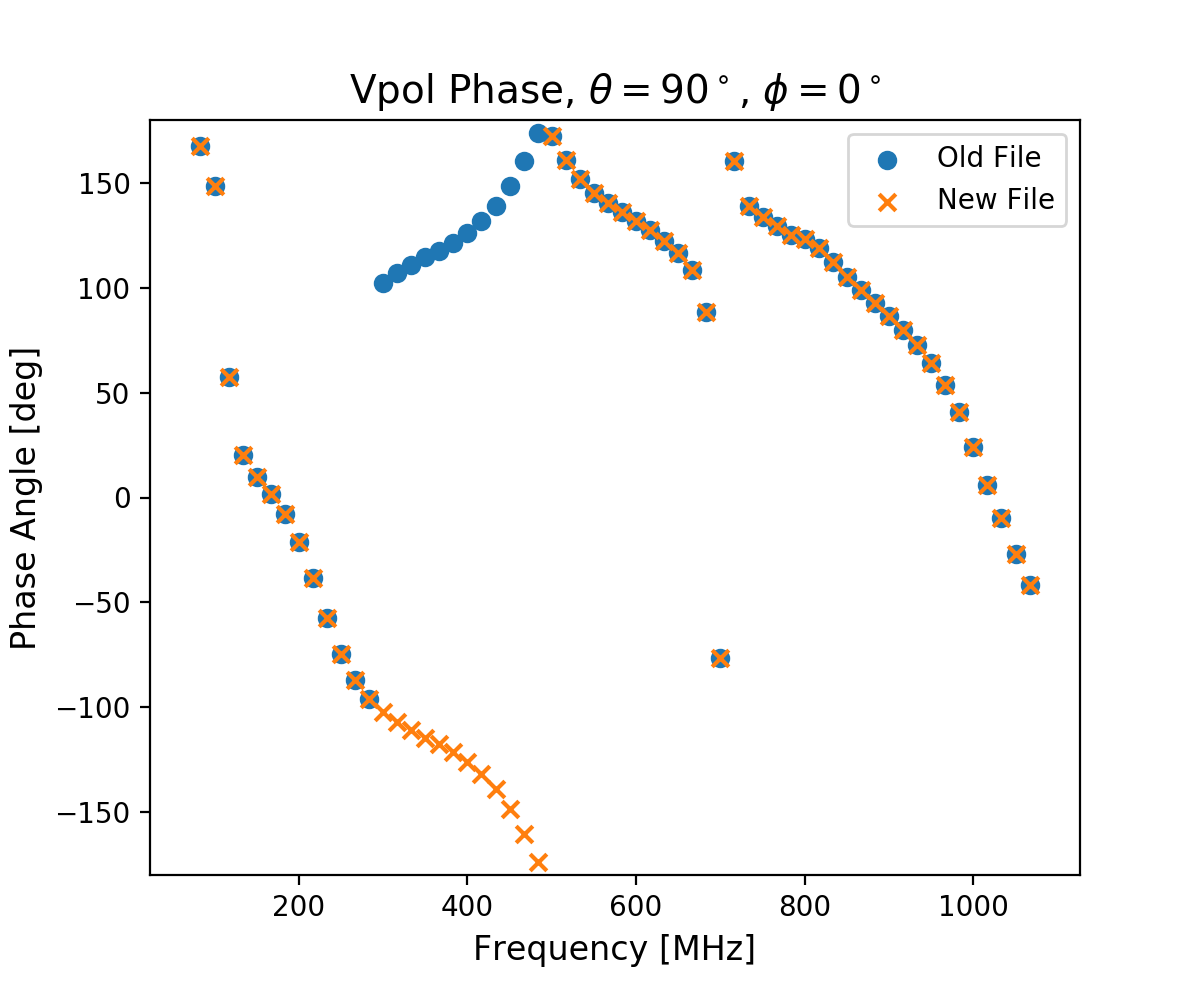 ARA_dipoletest1_output_updated2016.txt, but found that this file does not show the same error. In fact, for most angles the phase never drops below -100 degrees anyway, except for the single case of theta=180. The plots below show no difference after applying my script to fix phase angles:Since there was no change,