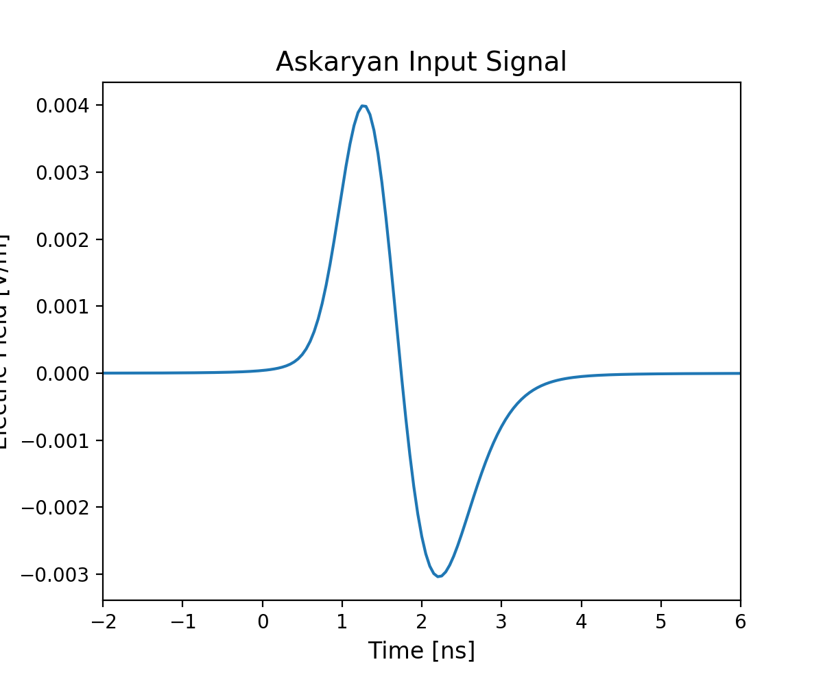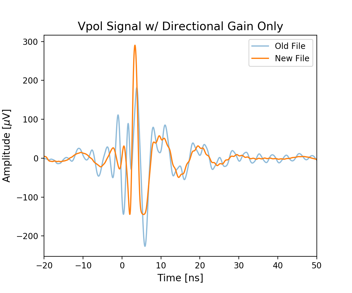 ARA_dipoletest1_output_updated2016.txtwas left alone.In regards to the physics effect of this change, the new corrected phases result in less "ringing" in the waveform. This is to be expected, since large spikes in phase angle (as in the old files) will result in ringing. The plots below illustrate the effect, taking a sample Askaryan signal and passing it through just the directional gain, and then the entire Vpol signal chain: