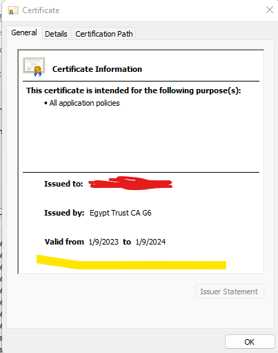 في الصورة السابقة شكل الشهادة الخاصة بالعميل والا تم تثبيتها من برنامج