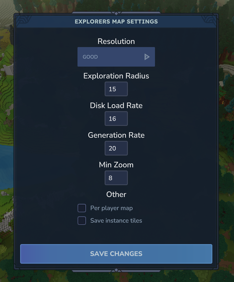 The mod can be configured in-game using the command /explorersmap. You will need to be op or have the permission explorersmap.command to run the command.