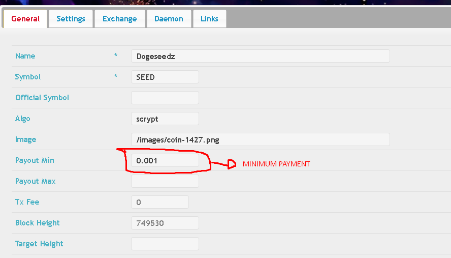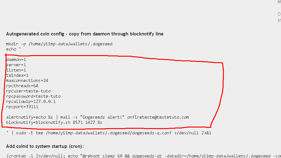- Now find your coin again and click on its symbol, and go straight to the Daemon tab, it will generate a config for your coin, copy only the red part, and put it in your coin config (example: ./dogeseedz/Dogeseedz. conf ) before saving change the path of blocknotify, in my case it is installed in /usr/bin/blocknotify.sh