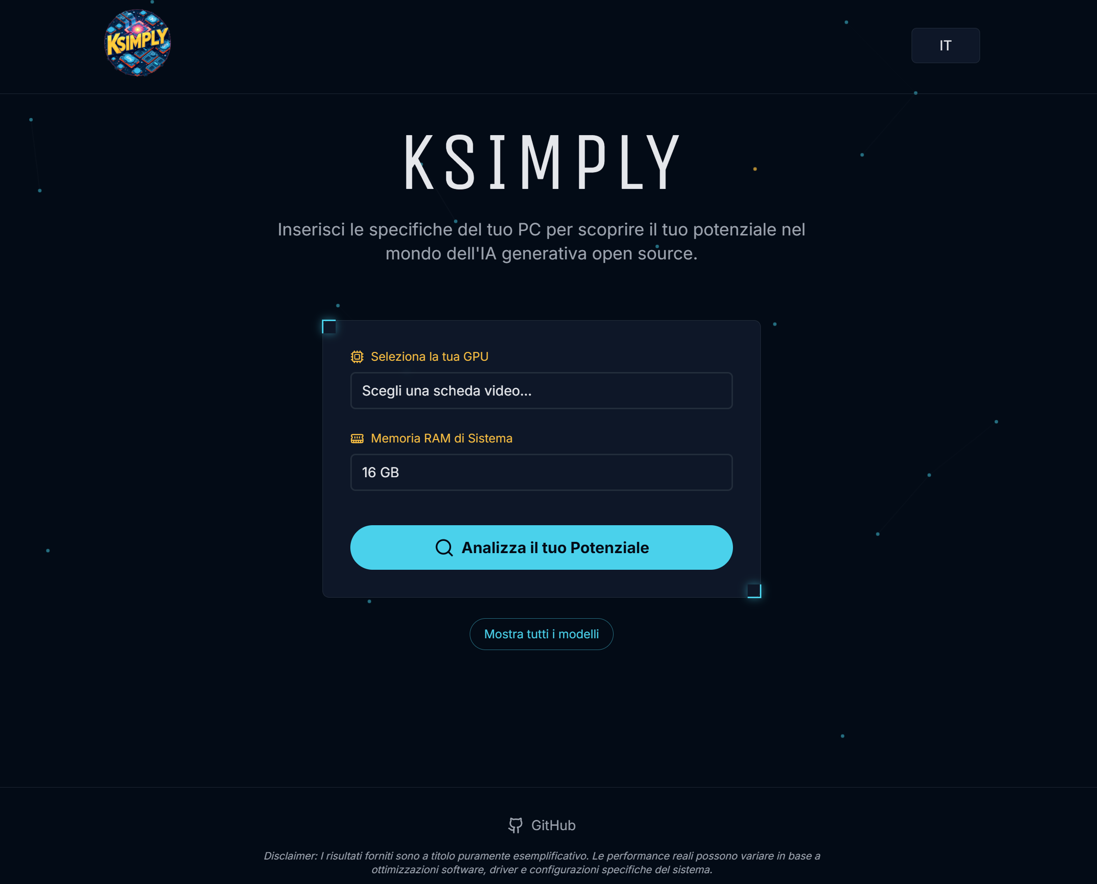 L'utente inserisce la propria GPU e la quantità di RAM di sistema, e KSimply interroga un database curato di modelli AI per fornire una lista di raccomandazioni dettagliate.