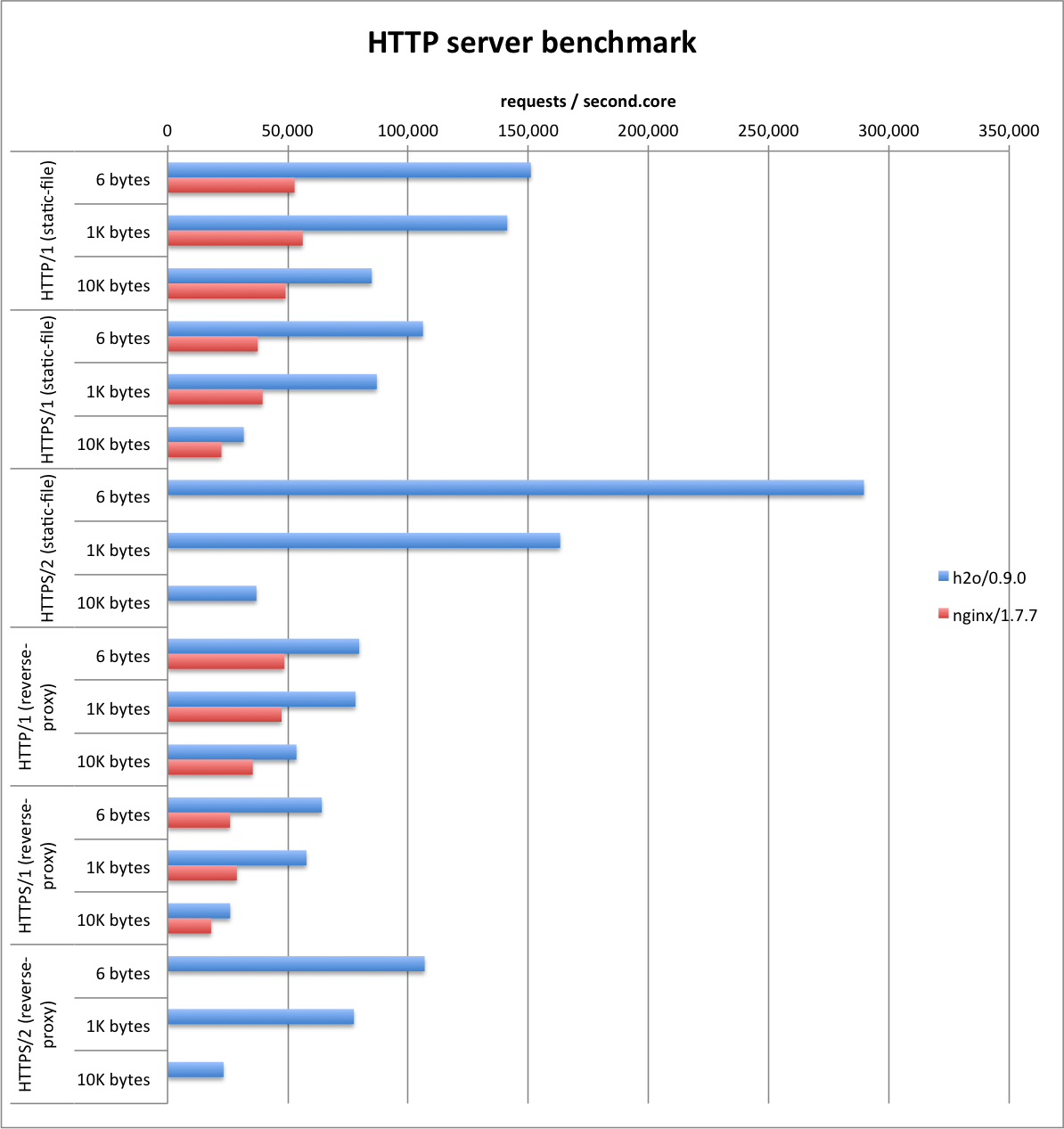 note: for reverse-proxy tests, another H2O process running on the same host was used as the upstream server