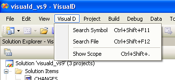 The search window helps you finding files in larger projects or symbol definitions. The window can be opened through the Visual D menu. It is more convenient to assign keyboard shortcuts to the commands "VisualD.!SearchFile" and "VisualD.!SearchSymbol".