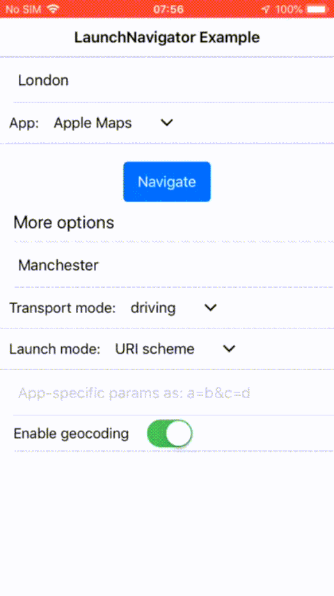 LaunchNavigator.LAUNCH_MODE.TURN_BY_TURN) - launches in Navigation view. Enables transport mode to be specified, but not start location or destination name. - Geo mode (